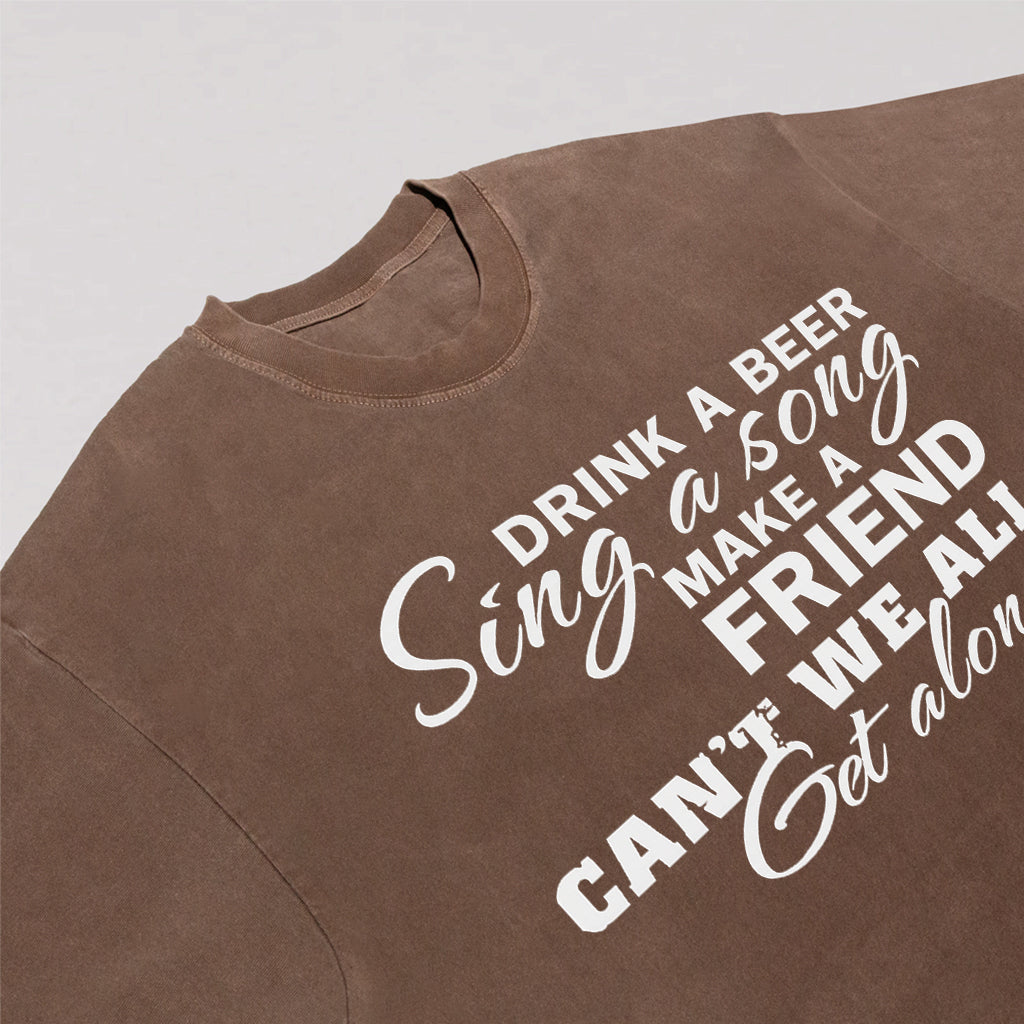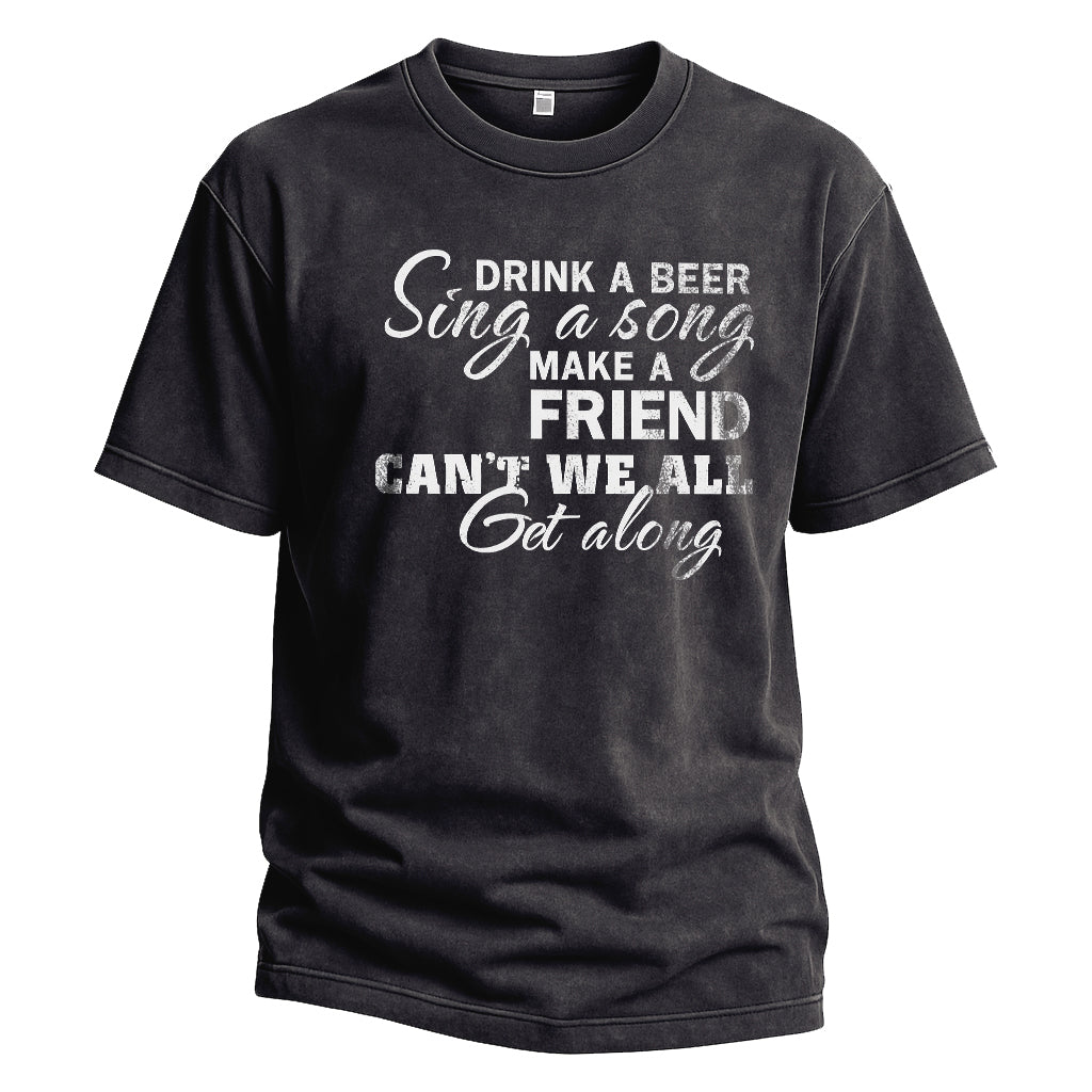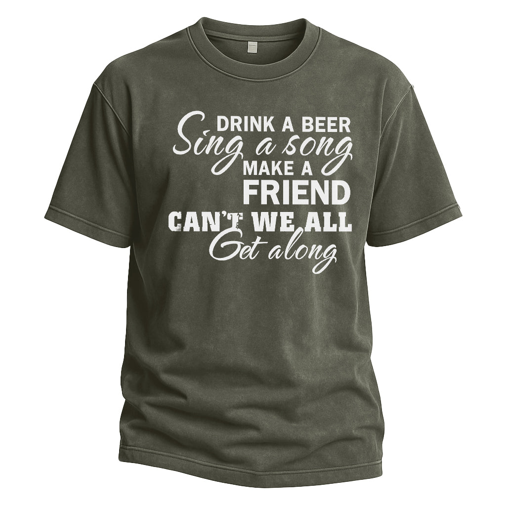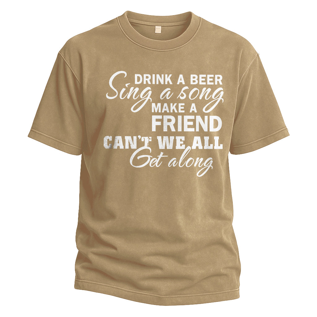 Precio regular $ 476.00 MXNCelebrate good times and friendship with LouMark’s Drink a Beer Sing a Song Tee. This washed tan shirt features a vintage-style white typography graphic with the phrase “DRINK A BEER SING A SONG MAKE A FRIEND CAN’T WE ALL GET ALONG.” Made from 100% cotton for comfortable, casual wear with a warm, welcoming vibe.