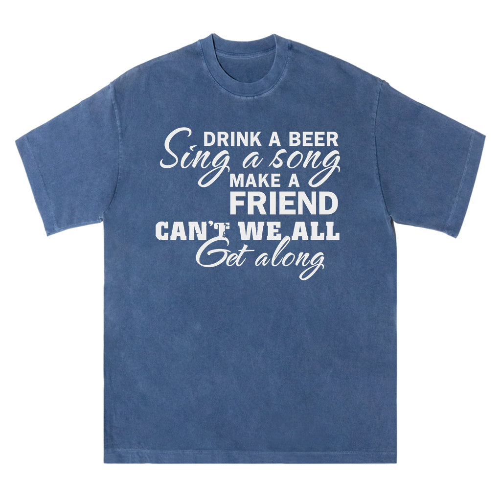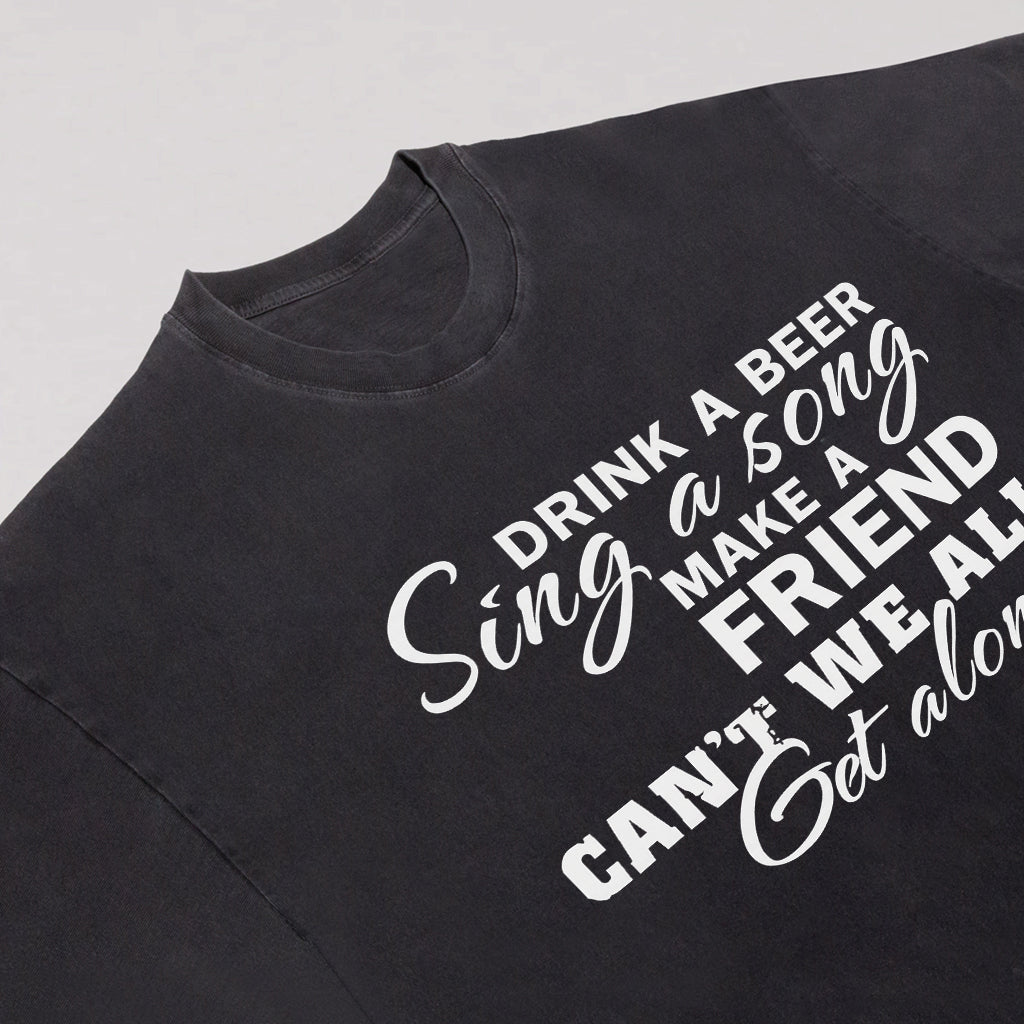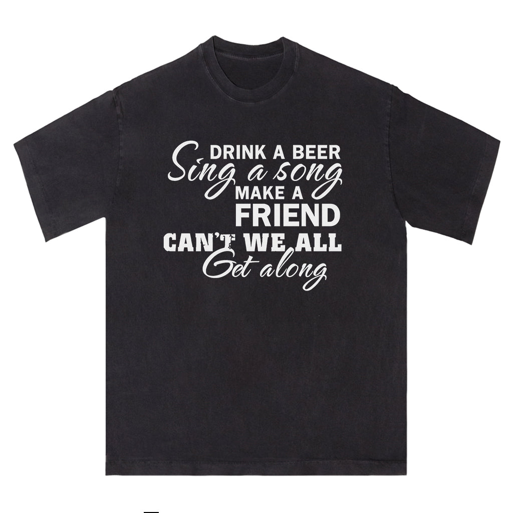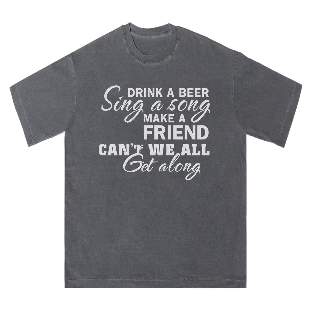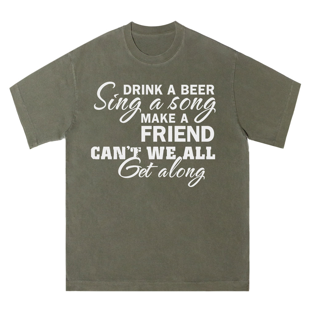 Precio regular $ 476.00 MXNCelebrate good times and friendship with LouMark’s Drink a Beer Sing a Song Tee. This washed tan shirt features a vintage-style white typography graphic with the phrase “DRINK A BEER SING A SONG MAKE A FRIEND CAN’T WE ALL GET ALONG.” Made from 100% cotton for comfortable, casual wear with a warm, welcoming vibe.