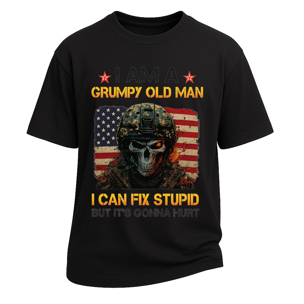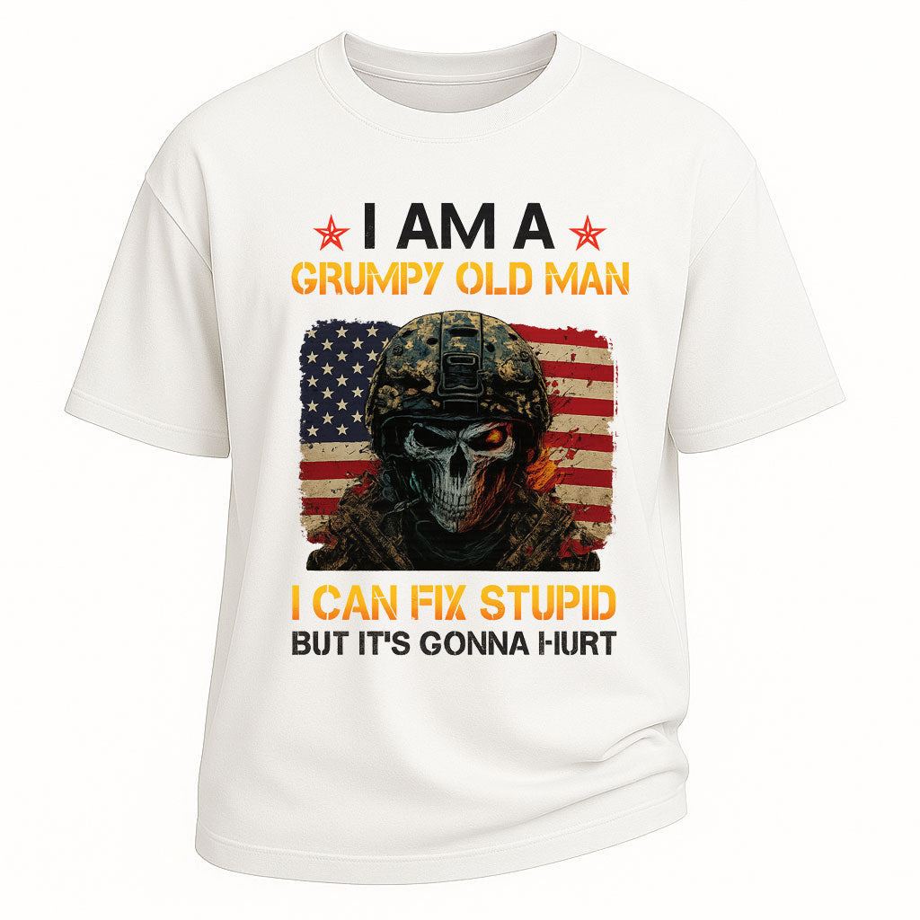 Precio regular $ 476.00 MXNTurn up the attitude with this Grumpy Old Man Fix Stupid graphic short-sleeve t-shirt. Made from 260G 100% cotton, this heavyweight tee offers both comfort and lasting wear. The striking design showcases a skull soldier in front of the American flag with the bold slogan “I AM A GRUMPY OLD MAN – I CAN FIX STUPID BUT IT’S GONNA HURT,” making it a statement piece with edgy humor. With its standard fit and classic crew neckline, it’s perfect for streetwear, casual outings, or themed parties.
