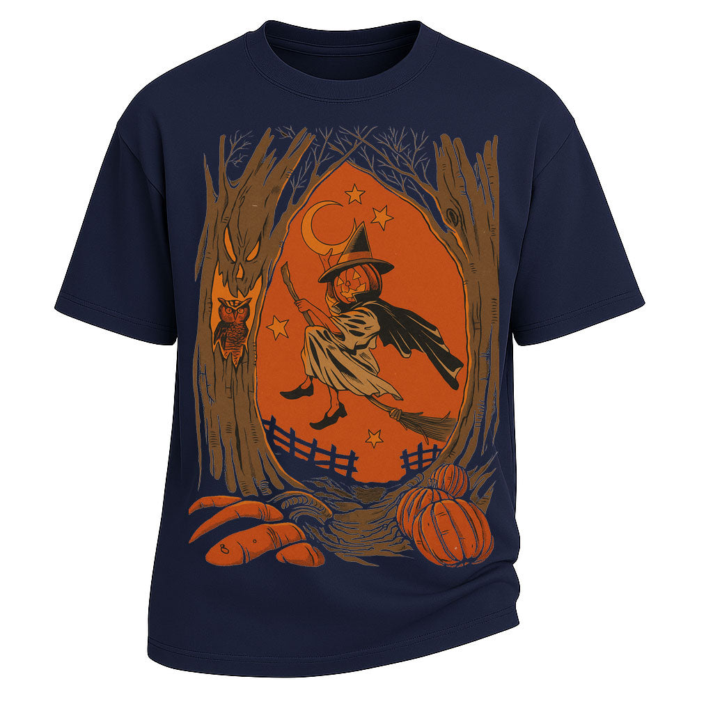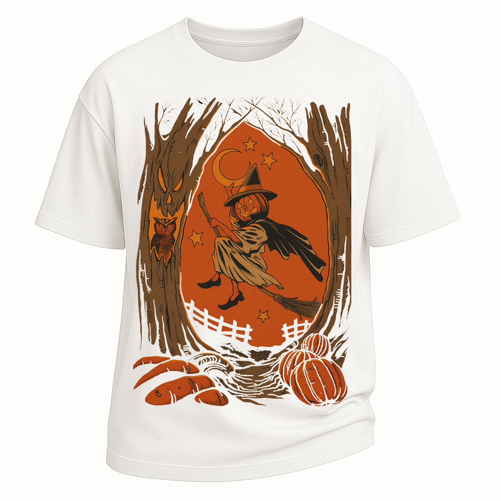 Precio regular $ 476.00 MXNStep into the spirit of Halloween with LouMark’s "Witch Pumpkin Patch" oversized tee. Crafted from 260G heavyweight 100% cotton, this shirt offers durability, comfort, and a premium oversized silhouette. The front showcases a vintage-inspired illustration of a witch flying past a crescent moon, framed by autumn trees, pumpkins, and rustic fall elements. Designed for those who love Halloween charm with a touch of retro artistry, it’s the perfect seasonal statement piece.