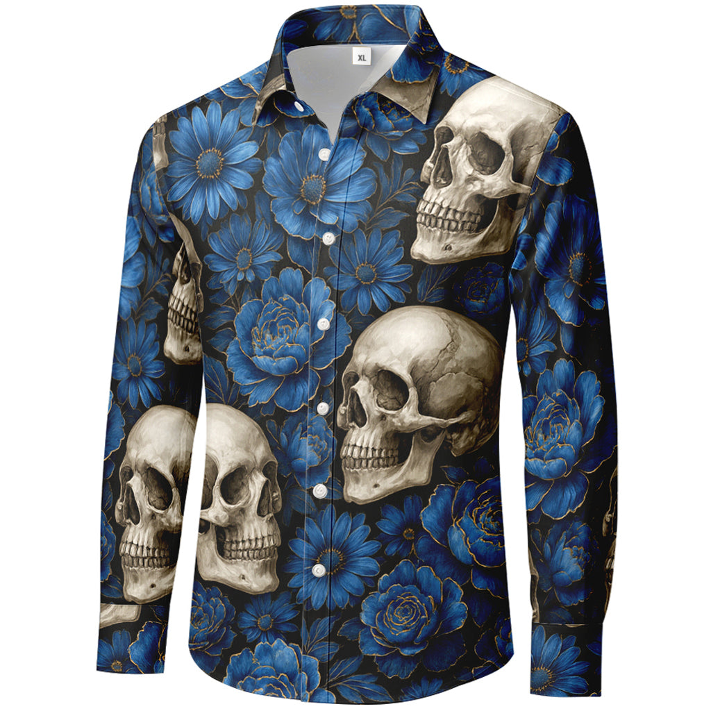 Langarmshirt mit blauem 3D-Druck von Totenköpfen mit Blumenmuster