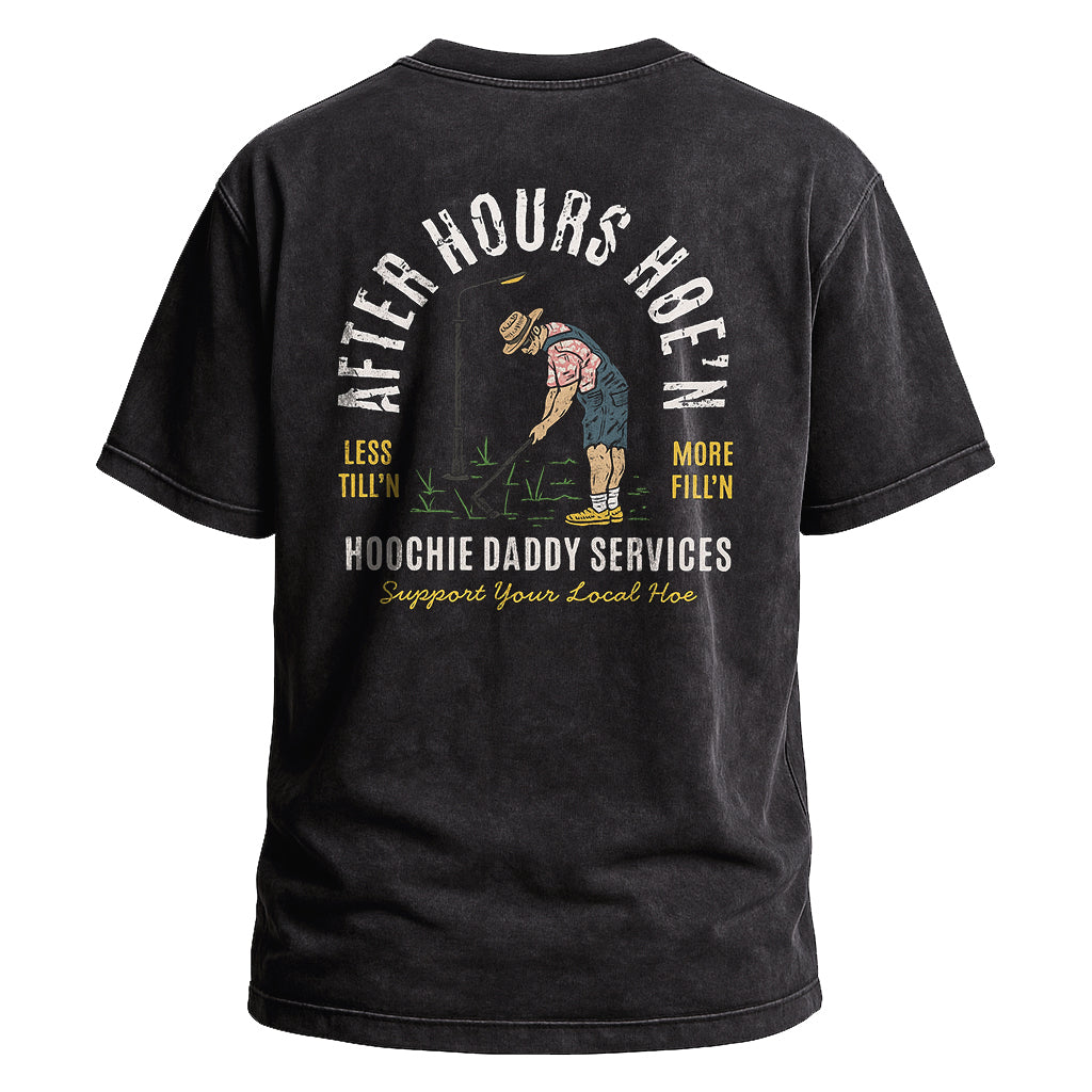 Regulärer Preis $ 475.00 MXNFeiern Sie den Arbeitsgeist mit LouMarks After Hours Home Tee. Dieses verwaschene braune Shirt zeigt auf der Rückseite eine Vintage-Grafik eines Mannes bei der Feldarbeit, umgeben von den Texten „AFTER HOURS HOEM“, „HOOCHIE DADDY SERVICES“ und „Support Your Local Man“. Hergestellt aus 100 % Baumwolle für hohen Tragekomfort und robusten Charme.