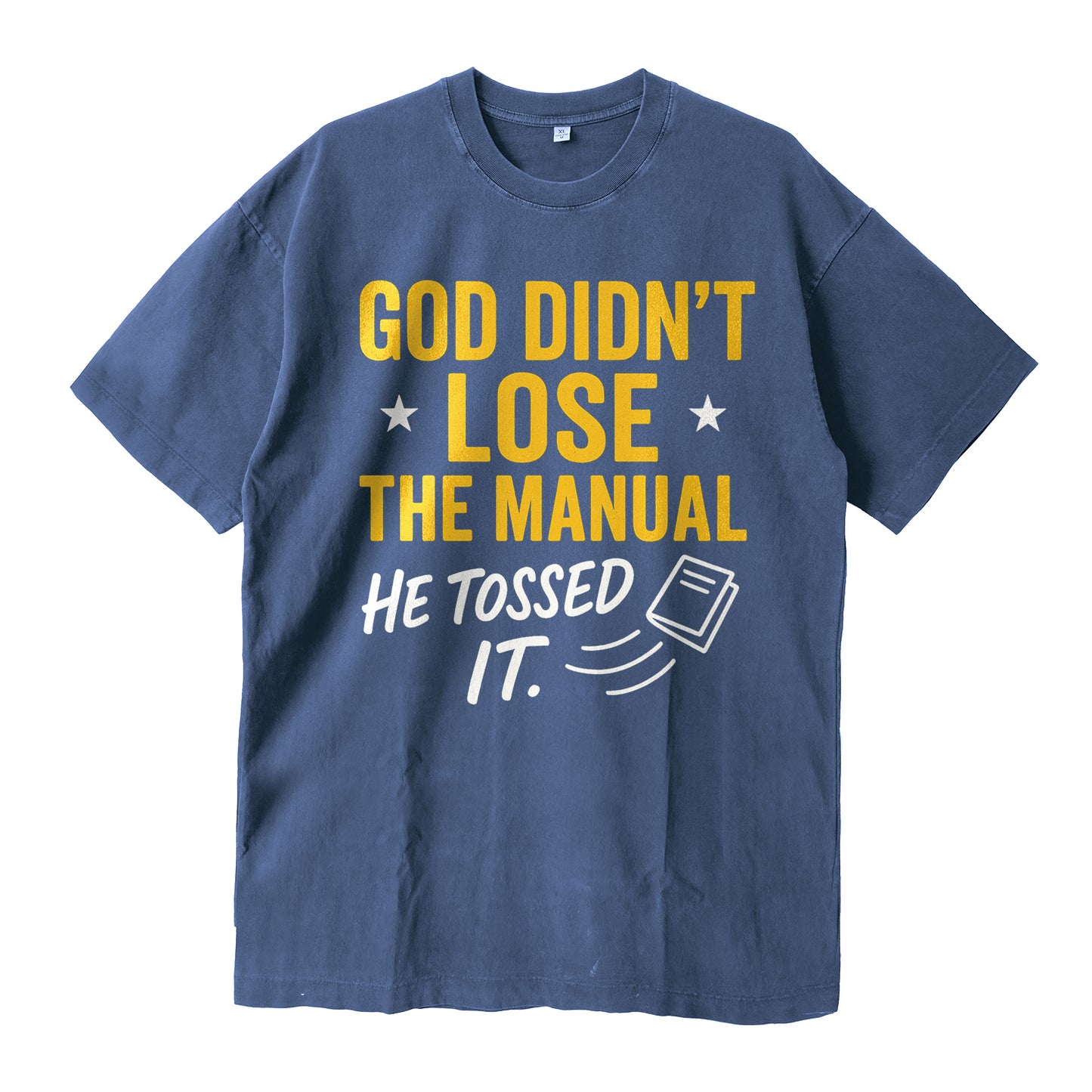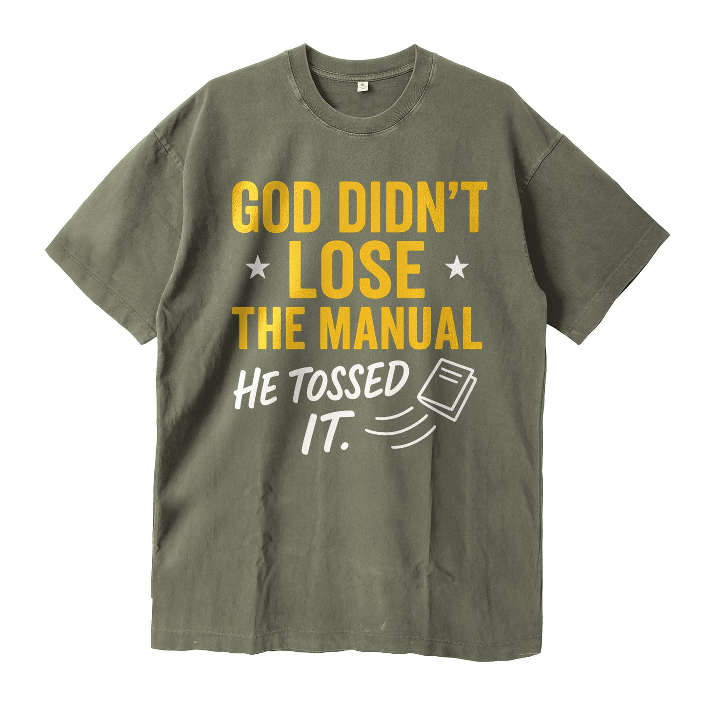 Dieses schwarze T-Shirt im Vintage-Look besticht durch einen auffälligen goldenen und weißen Schriftzug mit der Aufschrift „GOD DIDN'T LOSE THE MANUAL — HE TOSSED IT“. Gefertigt aus dichtem 260-g-Baumwollgewebe für ein weiches und dennoch formstabiles Tragegefühl und lange Haltbarkeit.