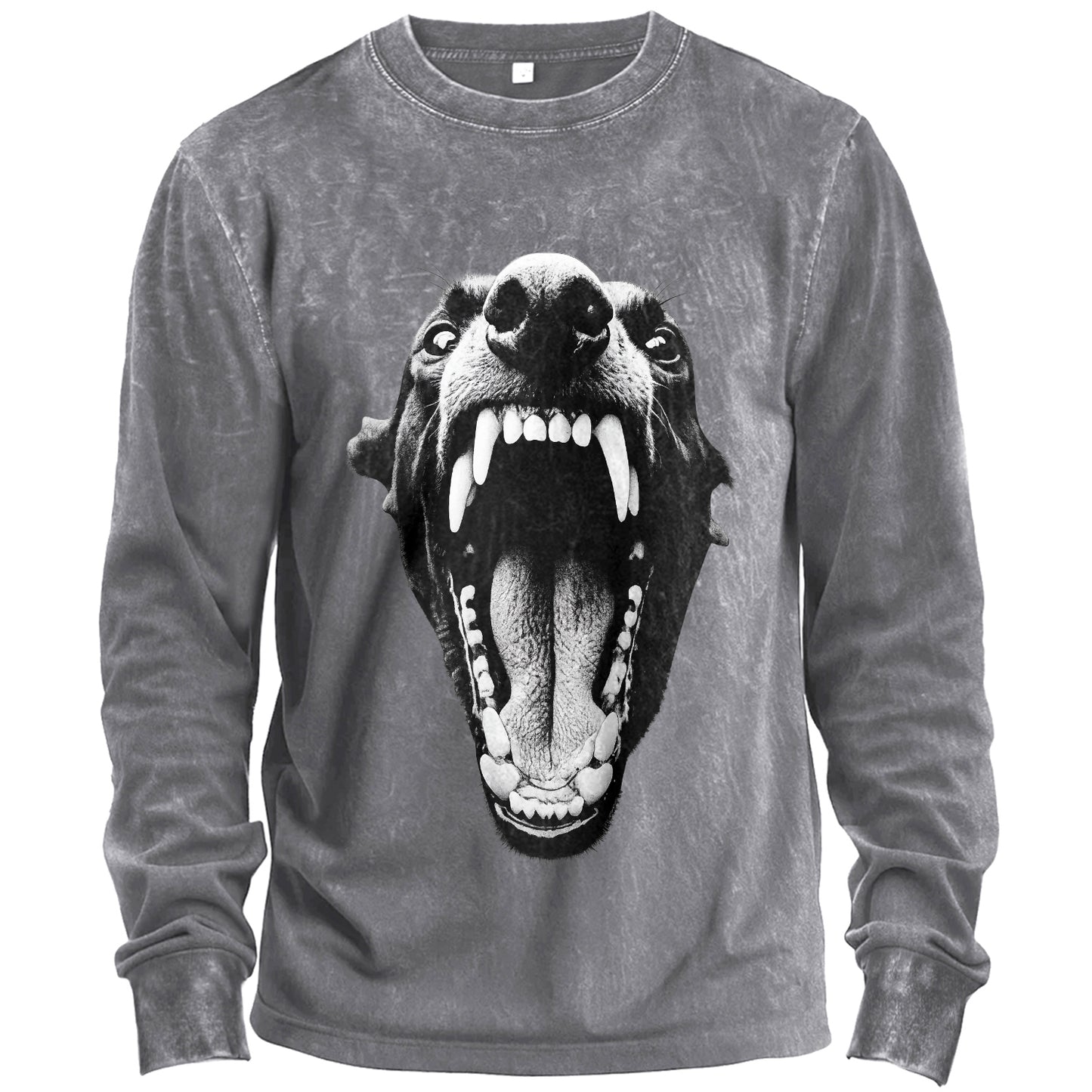 Regulärer Preis $ 438.00 MXNAuffällig und unübersehbar. Dieses langärmlige T-Shirt in Vintage-Optik und Armeegrün ziert ein großes Schwarz-Weiß-Motiv eines brüllenden Hundes – mit seinen markanten Zähnen. Gefertigt aus weicher 100% Baumwolle für ein angenehmes Tragegefühl vom ersten Moment an.
