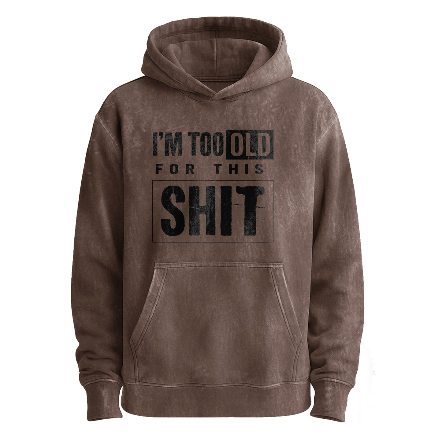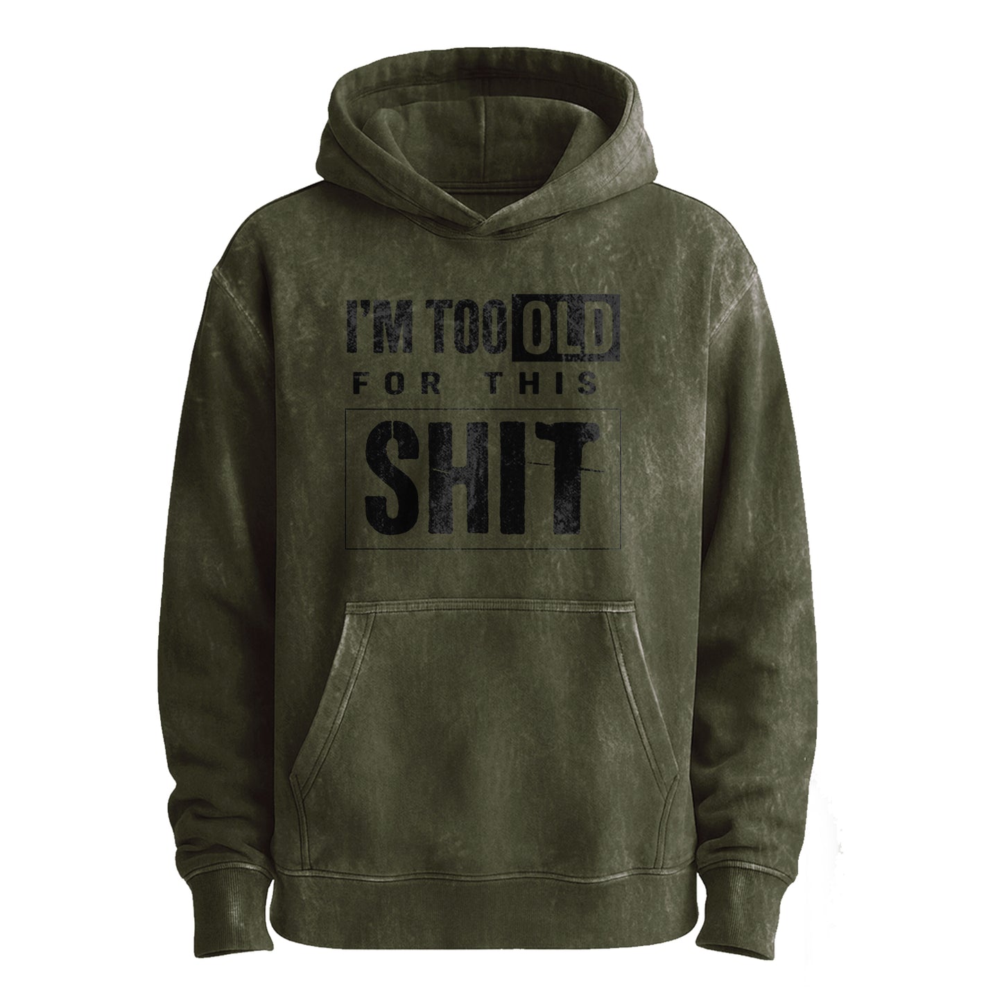 Dieser Vintage-Hoodie in Militärgrün besticht durch übergroße, abgenutzte weiße Schriftzüge: „I'M TOO“ über einem eingerahmten „OLD“, dann „FOR THIS“, abgerundet durch einen großen, umrandeten Block mit der Aufschrift „SHIT“.