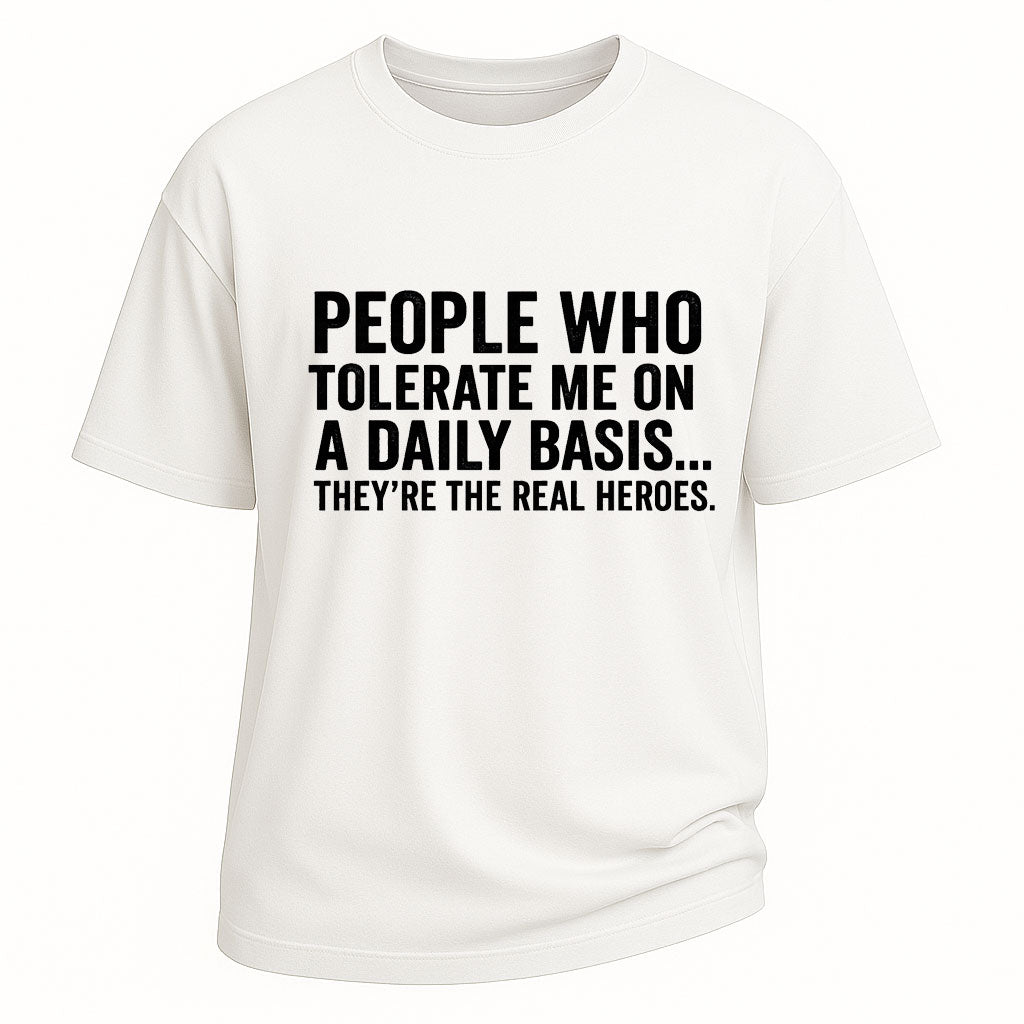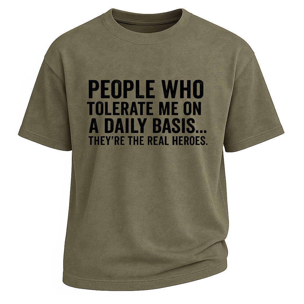 Regulärer Preis $ 473.00 MXNVerleihe deiner Garderobe mit diesem Kurzarm-T-Shirt mit dem Aufdruck „Real Heroes“ einen humorvollen Touch. Das aus 100 % Baumwolle (260 g/m²) gefertigte, schwere Shirt ist besonders bequem und strapazierfähig. Der auffällige Text „Menschen, die mich täglich tolerieren … sie sind die wahren Helden“ sorgt für einen witzigen, leicht sarkastischen Look. Dank der regulären Passform und des klassischen Rundhalsausschnitts ist dieses Shirt ideal für Freizeit, Partys oder Streetwear .