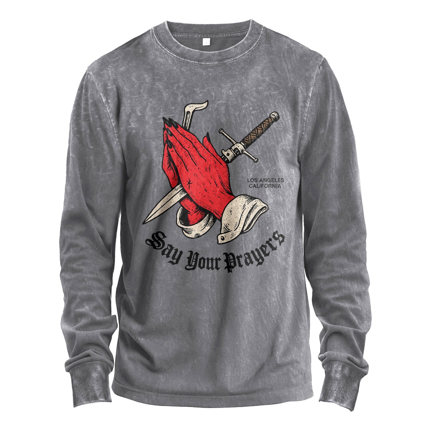Regulärer Preis $ 438.00 MXNGlauben trifft Streetwear. Vintage-gewaschenes, olivgrünes Langarmshirt mit markantem Print: Rote betende Hände über gekreuzten Klingen und Schwertern sowie der gotische Schriftzug „Say Your Prayers“. Gefertigt aus robustem 230-g-Baumwollstoff für ein weiches und langlebiges Tragegefühl.