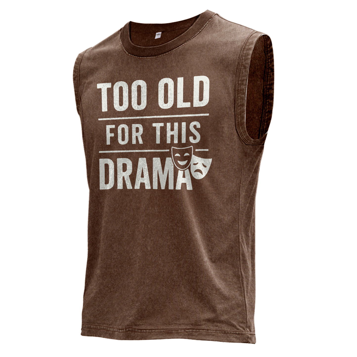 Dieses braune Vintage-Muskelshirt besticht durch übergroße, abgenutzte weiße Schriftzüge mit der Aufschrift „TOO OLD / FOR THIS / DRAMA“, die durch klare Linien voneinander getrennt sind und mit klassischen Komödien-Tragödien-Masken kombiniert werden.