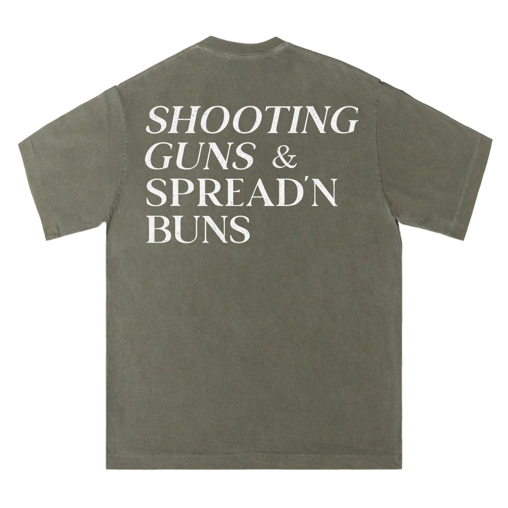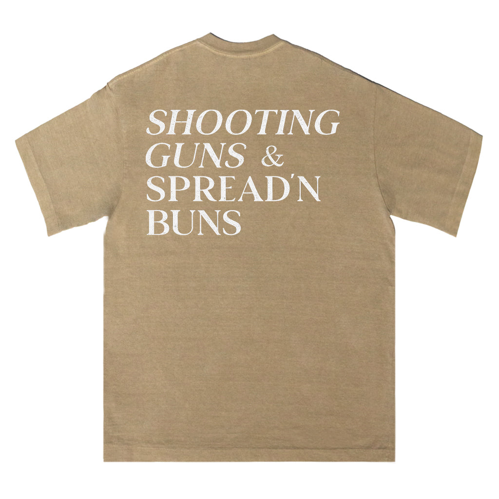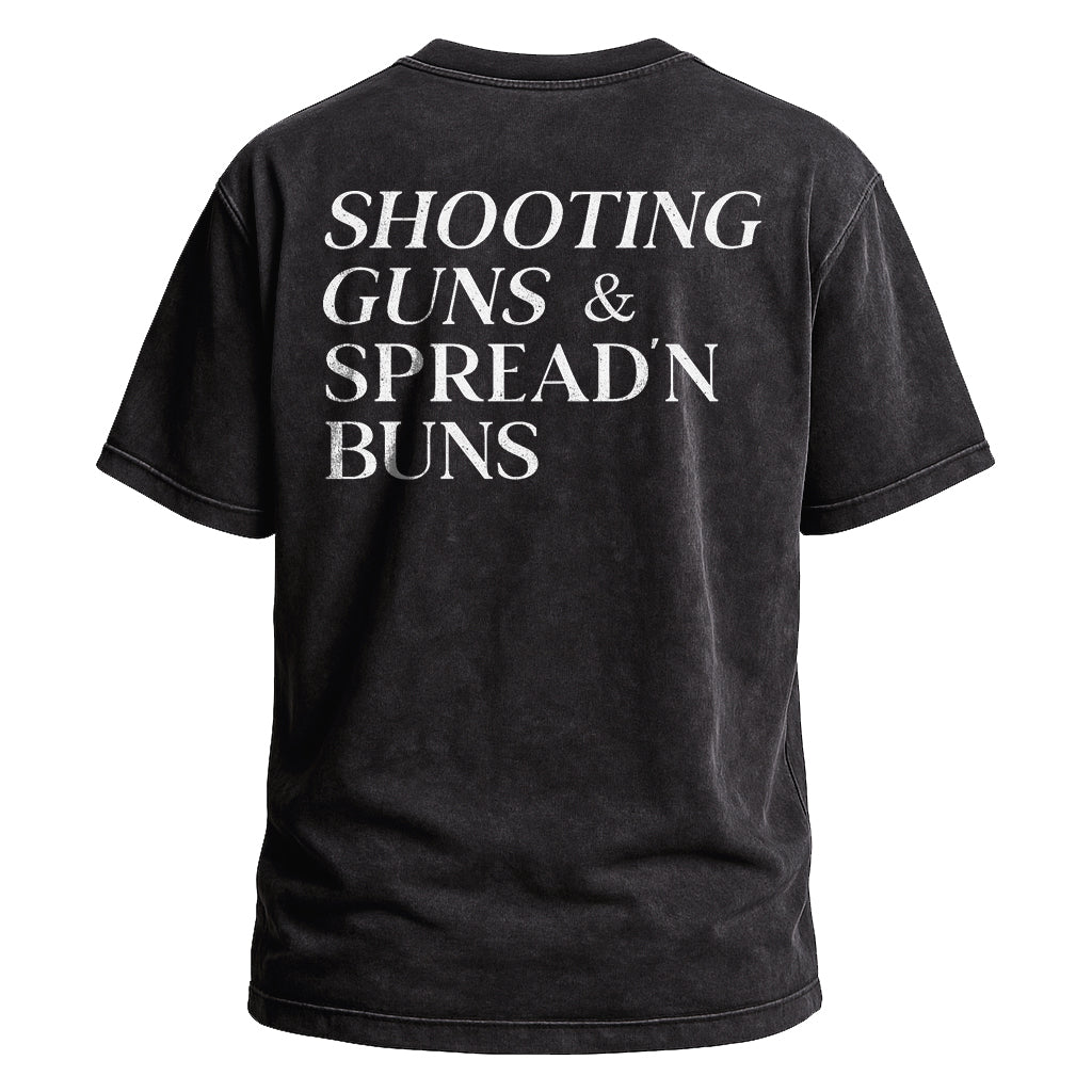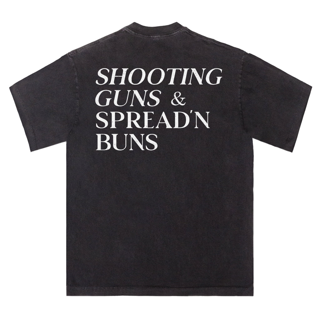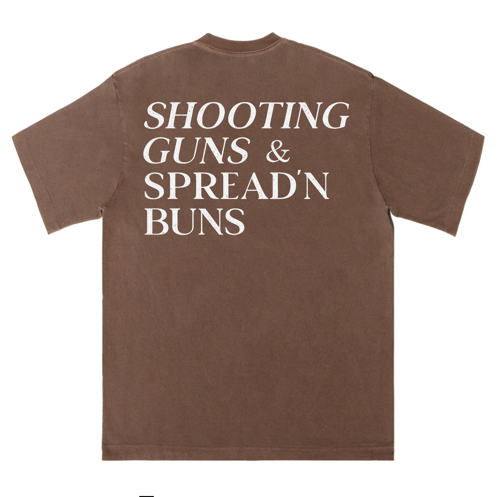 Regular price $ 474.00 MXNMake a bold and playful statement with LouMark’s Shooting Guns & Spread'n Buns Tee. This washed brown shirt features vintage-style white typography on the back with the words “SHOOTING GUNS & SPREAD'N BUNS.” Crafted from 100% cotton for comfortable casual wear with cheeky attitude.