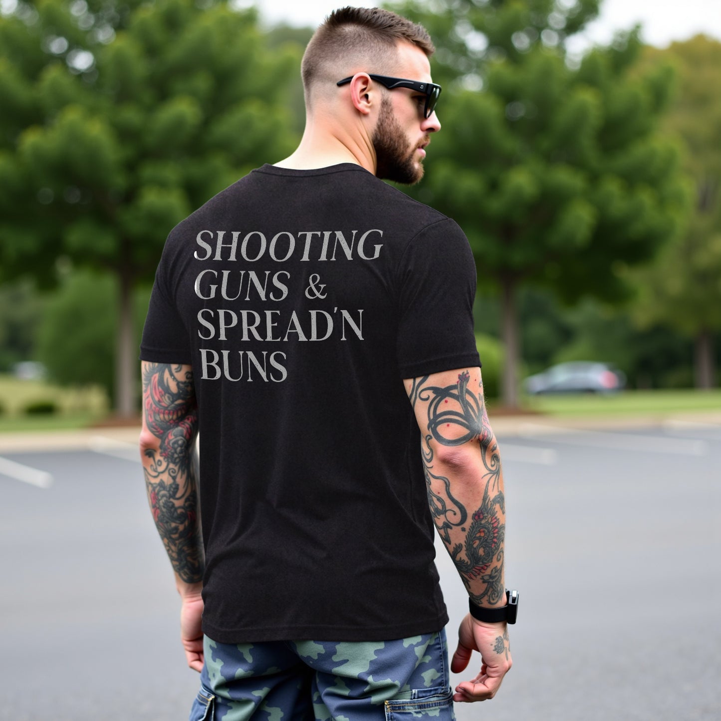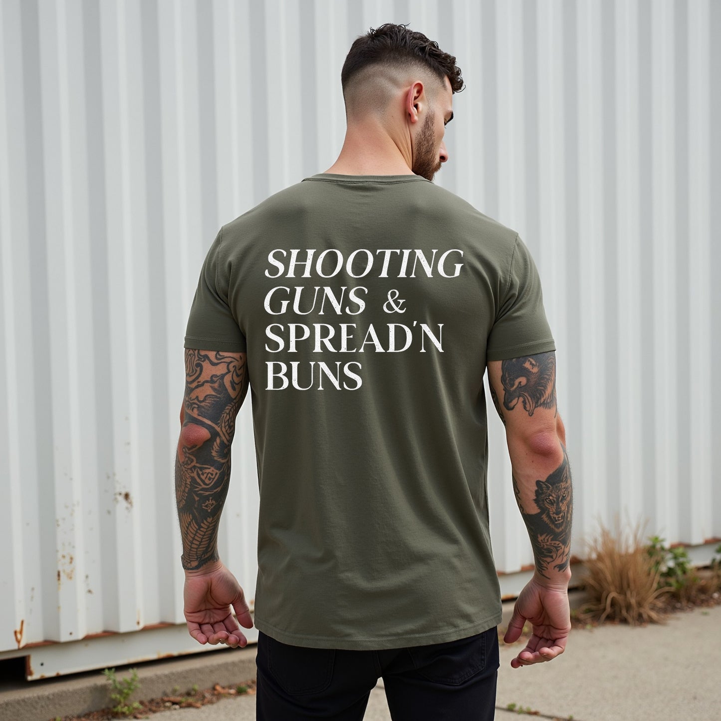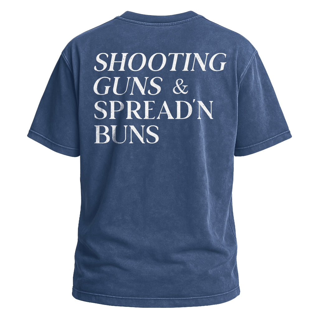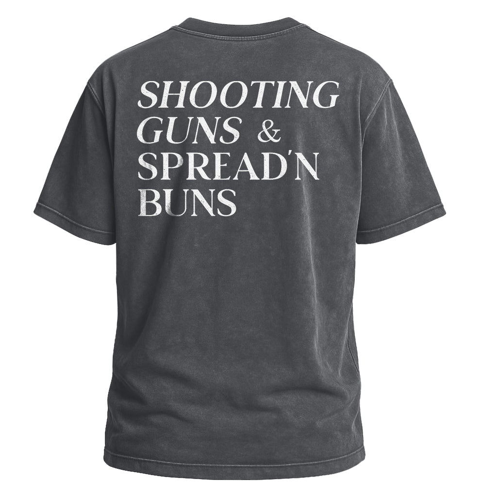Regular price $ 474.00 MXNMake a bold and playful statement with LouMark’s Shooting Guns & Spread'n Buns Tee. This washed brown shirt features vintage-style white typography on the back with the words “SHOOTING GUNS & SPREAD'N BUNS.” Crafted from 100% cotton for comfortable casual wear with cheeky attitude.