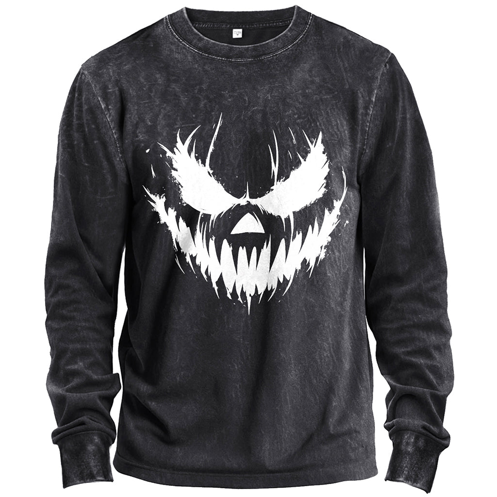 Embrace the dark side with LouMark’s Evil Grin Halloween long-sleeve t-shirt. Made from 230G 100% cotton, this heavy-weight tee ensures durability with all-day comfort. The standard fit design makes it versatile for layering or wearing solo. The bold front graphic features a sinister white grin with sharp jagged edges, creating a spooky Halloween-ready look with streetwear attitude. Ribbed cuffs and a crew neckline lock in the classic silhouette.