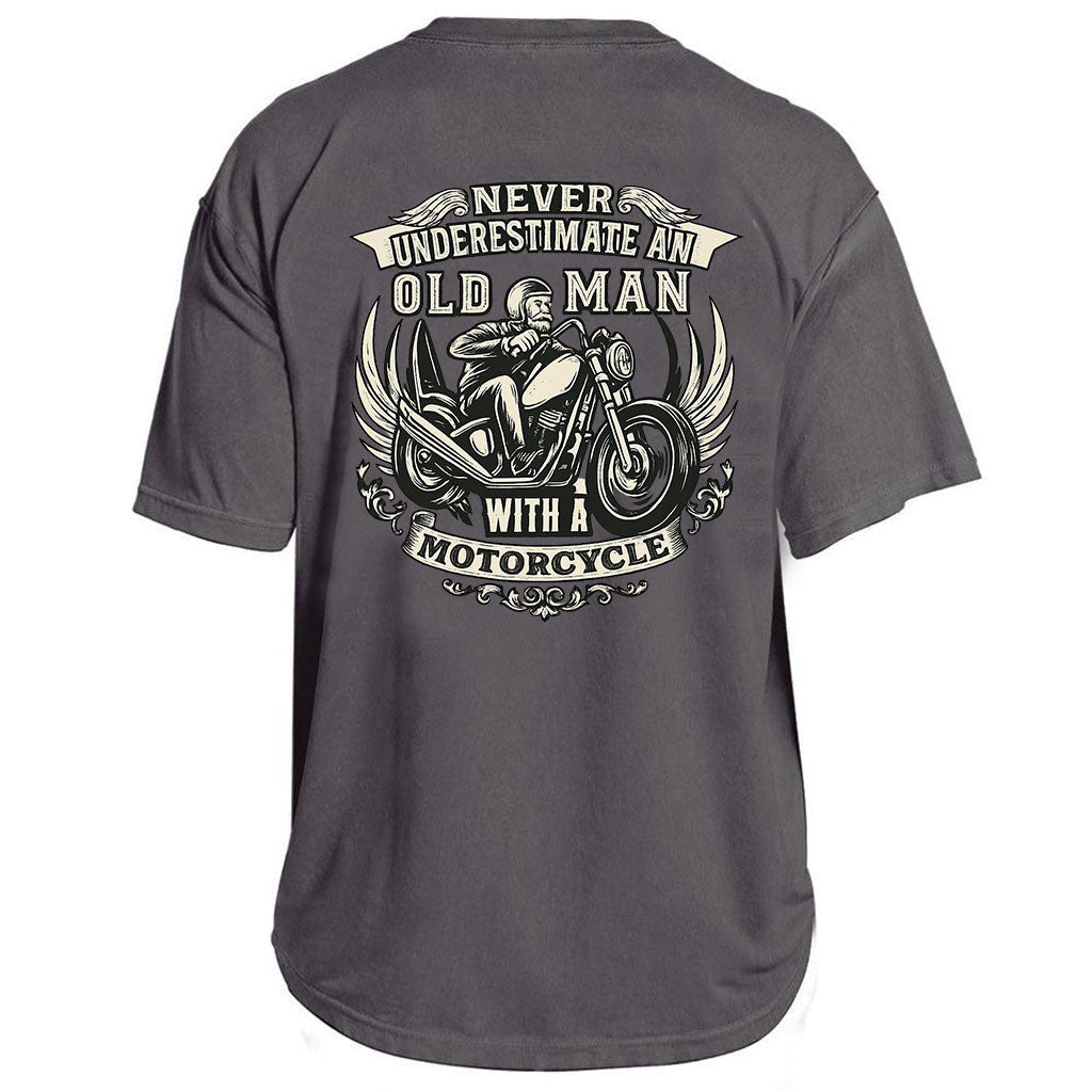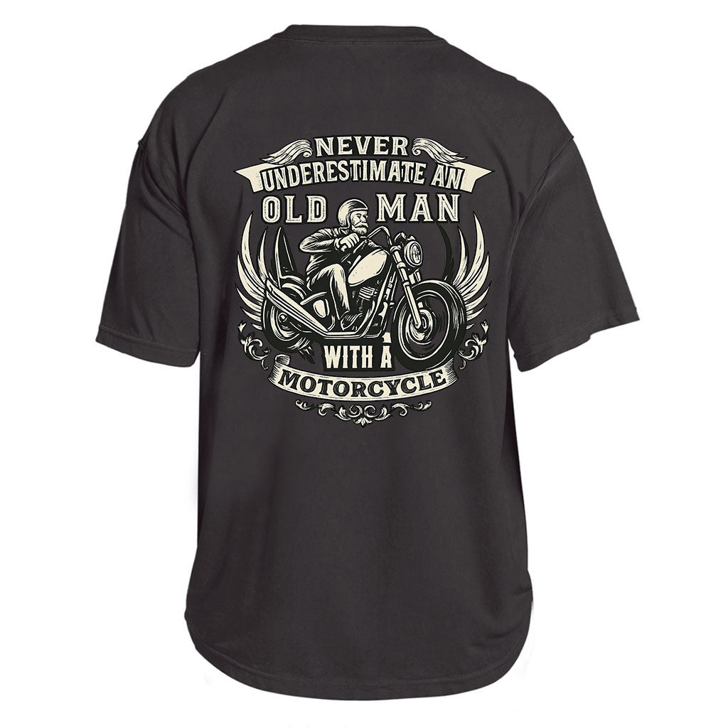 Regular price $ 403.00 MXNDon’t let the years fool you—age comes with horsepower. This LouMark signature tee features a rugged “Never Underestimate an Old Man with a Motorcycle” full-back print, paired with our embroidered steer skull chest logo. It's a tribute to the kind of men who don't slow down, just shift gears. Whether you're roaring down the highway or posting up at the local bar, this tee makes sure they know you're still riding hard.