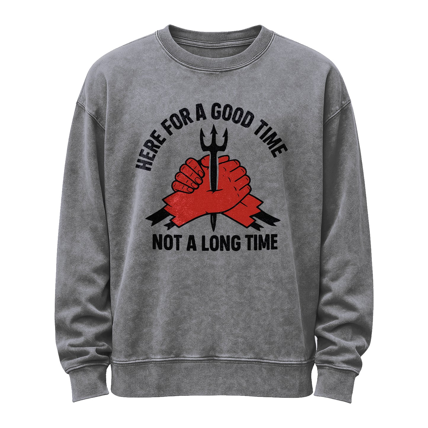 Prix régulier $ 787.00 MXNLive it up. This vintage-washed ash grey sweatshirt features bold black typography—“HERE FOR A GOOD TIME / NOT A LONG TIME”—framing a striking red hands-and-trident graphic over a ribbon. Built from substantial 350g fleece (80% cotton / 20% polyester) for a soft, broken-in feel right out of the bag.