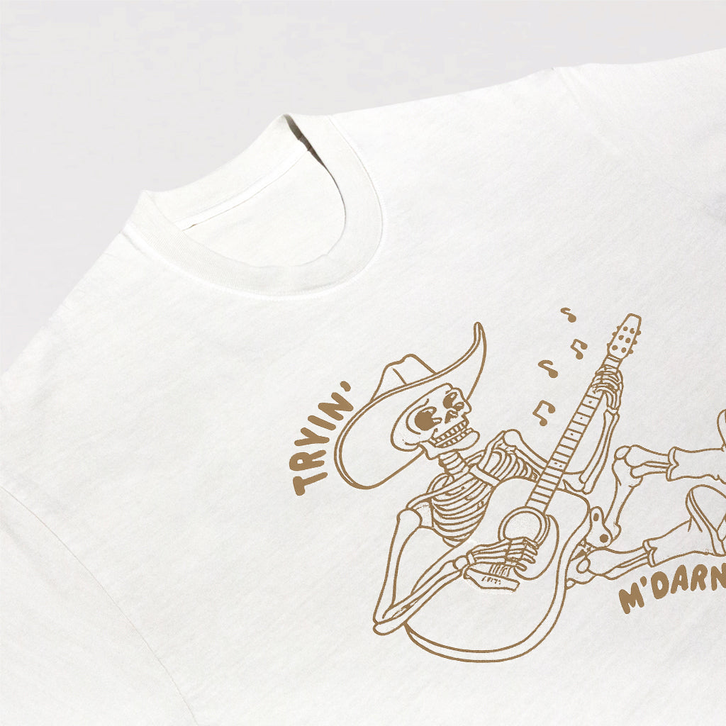 Prix régulier $ 473.00 MXNCelebrate classic country charm with LouMark’s Irwin & Darnell Cowboy Tee. This white shirt features a vintage-style sepia graphic of a cowboy playing guitar, surrounded by musical notes and the names “Irwin & Darnell.” Made from 100% cotton, it offers timeless comfort and Western musical spirit.