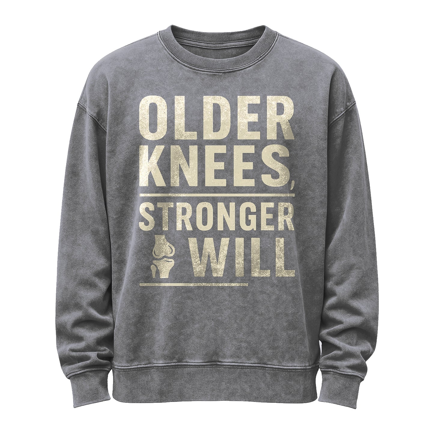 This vintage washed-black crewneck features oversized, distressed white typography reading “OLDER KNEES, STRONGER WILL,” accented by a knee joint icon and clean rule lines.