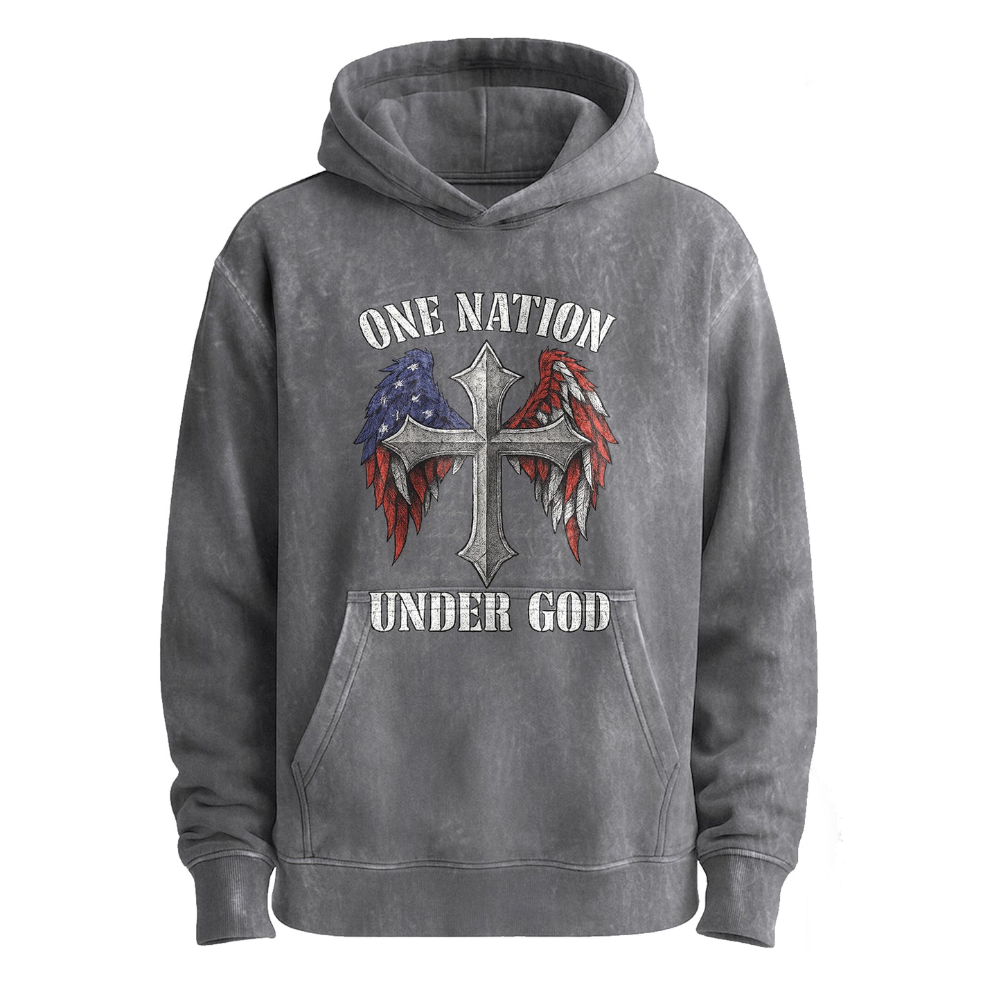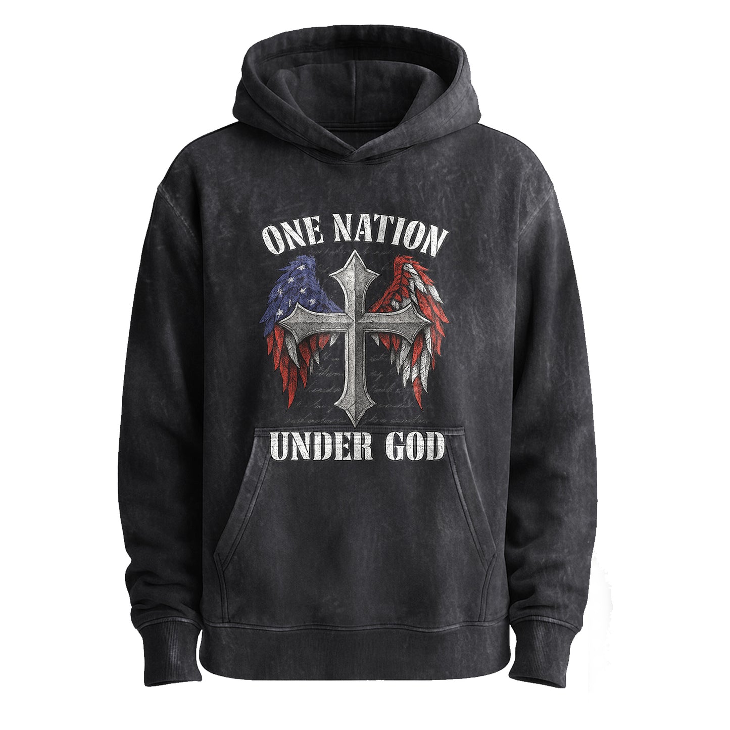 Prix régulier $ 788.00 MXNFaith, grit, and heritage in one piece. This vintage-washed army-green hoodie showcases a bold metal cross flanked by wings in red, white, and blue with the phrase “ONE NATION UNDER GOD.” Crafted from beefy 350g 80% cotton for a soft, broken-in feel right out of the bag.