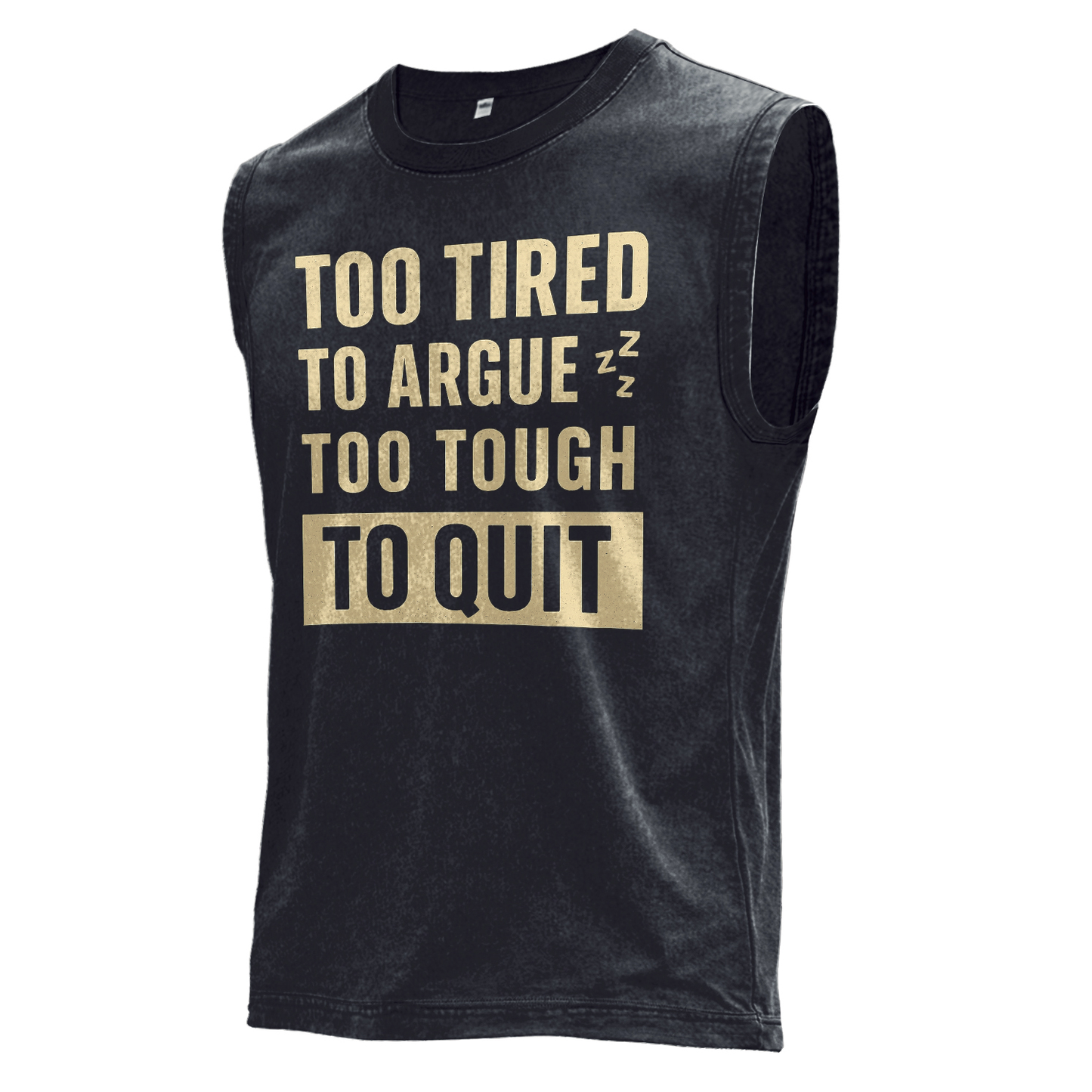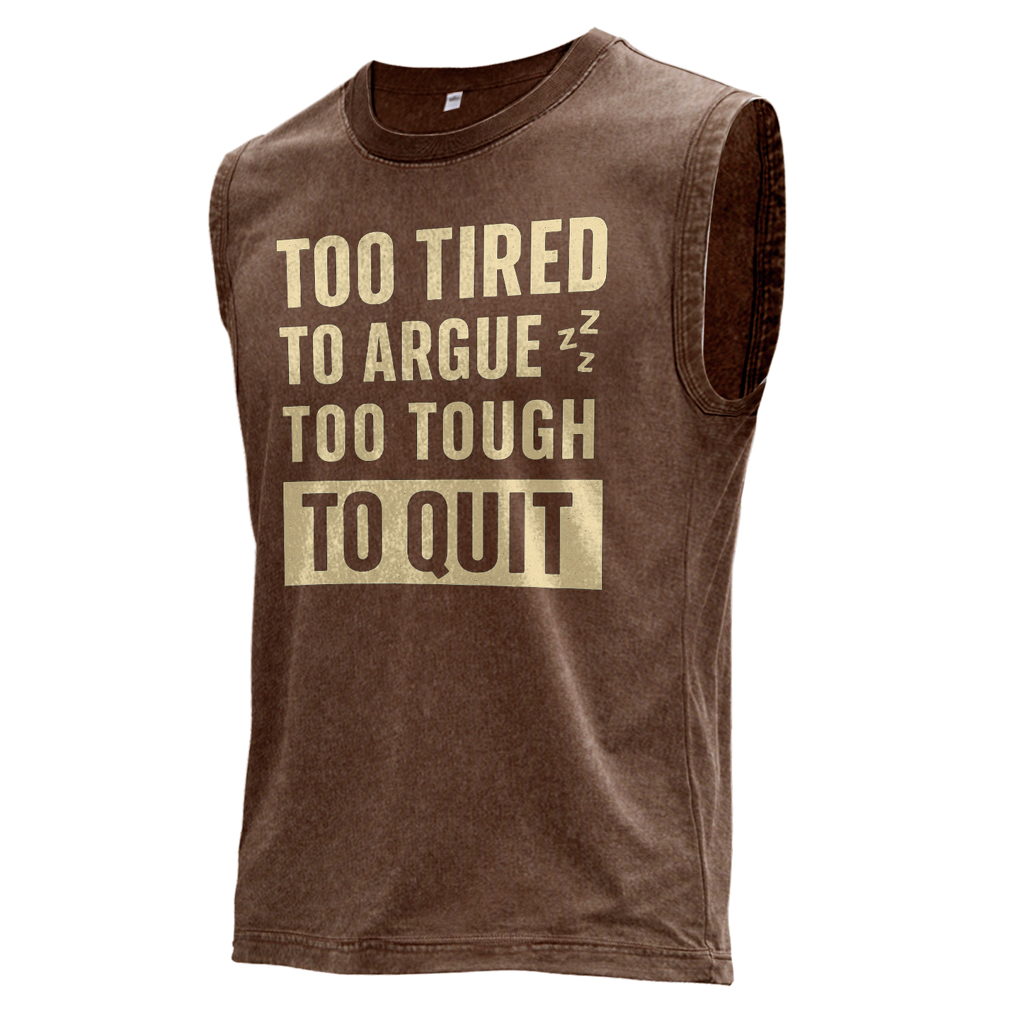 This vintage brown muscle tee features oversized, distressed bone/ivory typography stacking “TOO TIRED / TO ARGUE,” accented by tiny Zzz marks, then a bold cream block badge reading “TO QUIT” beneath “TOO TOUGH.”