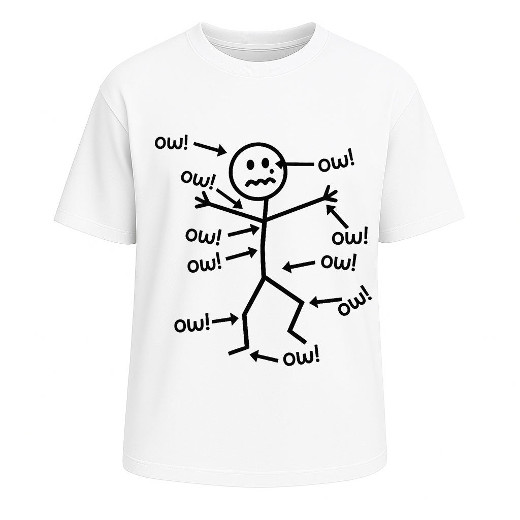 Prezzo normale $ 403.00 MXNPer l'uomo il cui corpo fa rumore come un vialetto di ghiaia quando si alza in piedi, LouMark presenta la maglietta "Ahi!" Stickman. Questa maglietta verde oliva raffigura un omino stilizzato, in cui è facile immedesimarsi, con frecce che puntano a ogni articolazione e arto, tutte etichettate con la scritta "Ahi!".