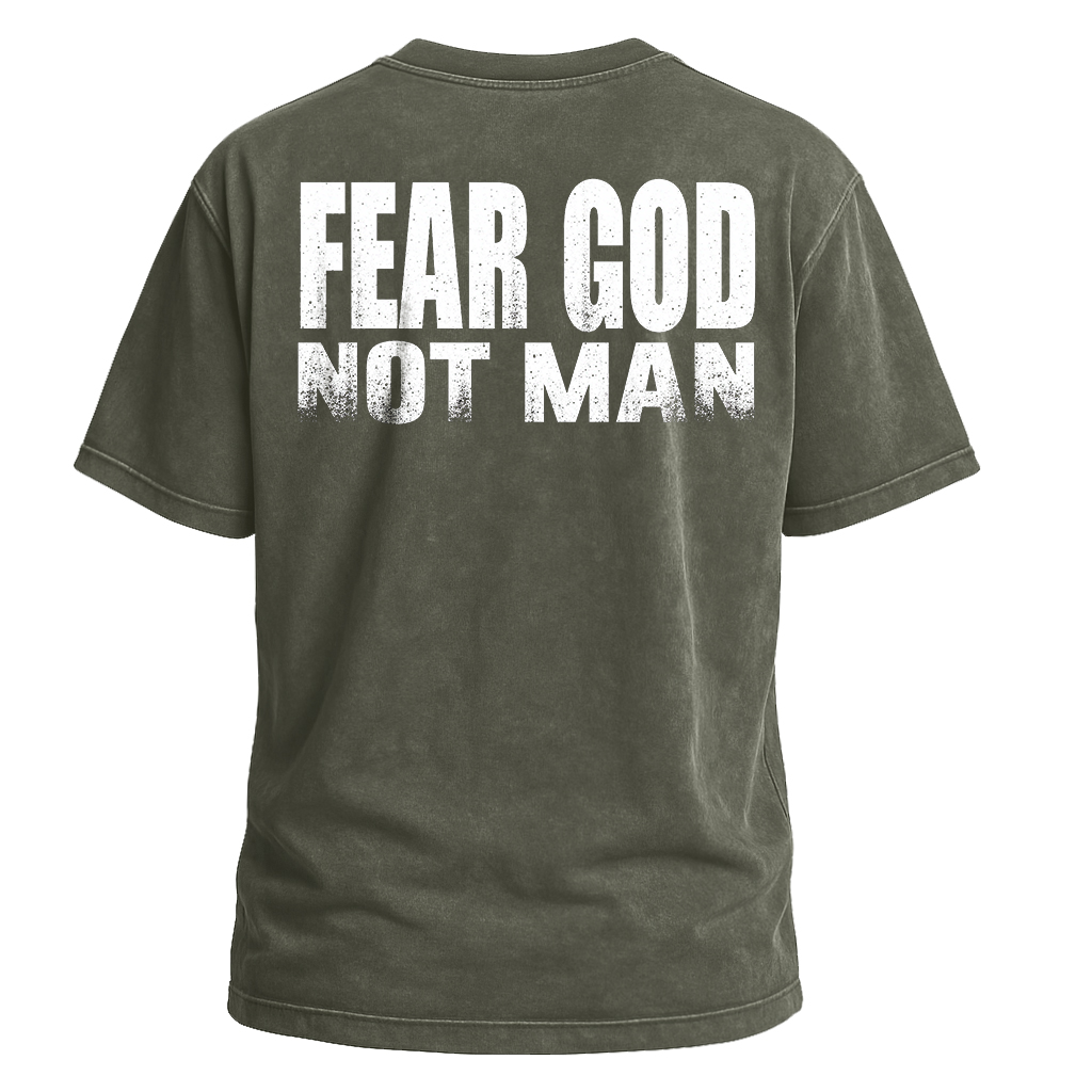 Sii eretto, cammina con audacia e temi solo Colui che regna in alto. Questa maglietta porta un messaggio potente in stampa bianca anticata su una robusta base di cotone verde militare lavato: "TEMI DIO, NON L'UOMO". Che tu stia difendendo la tua fede, la tua famiglia o la tua libertà, questa maglietta ti tiene dritto e le tue convinzioni più forti. Nessuna tendenza, nessun compromesso: solo verità.