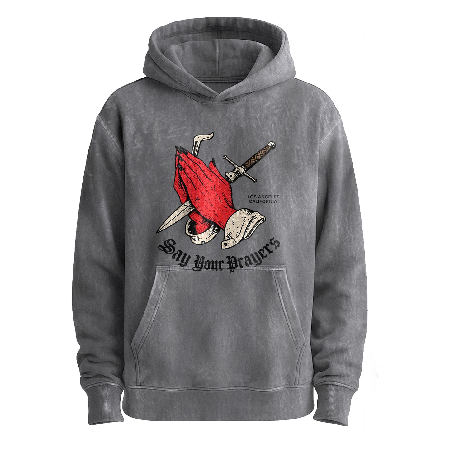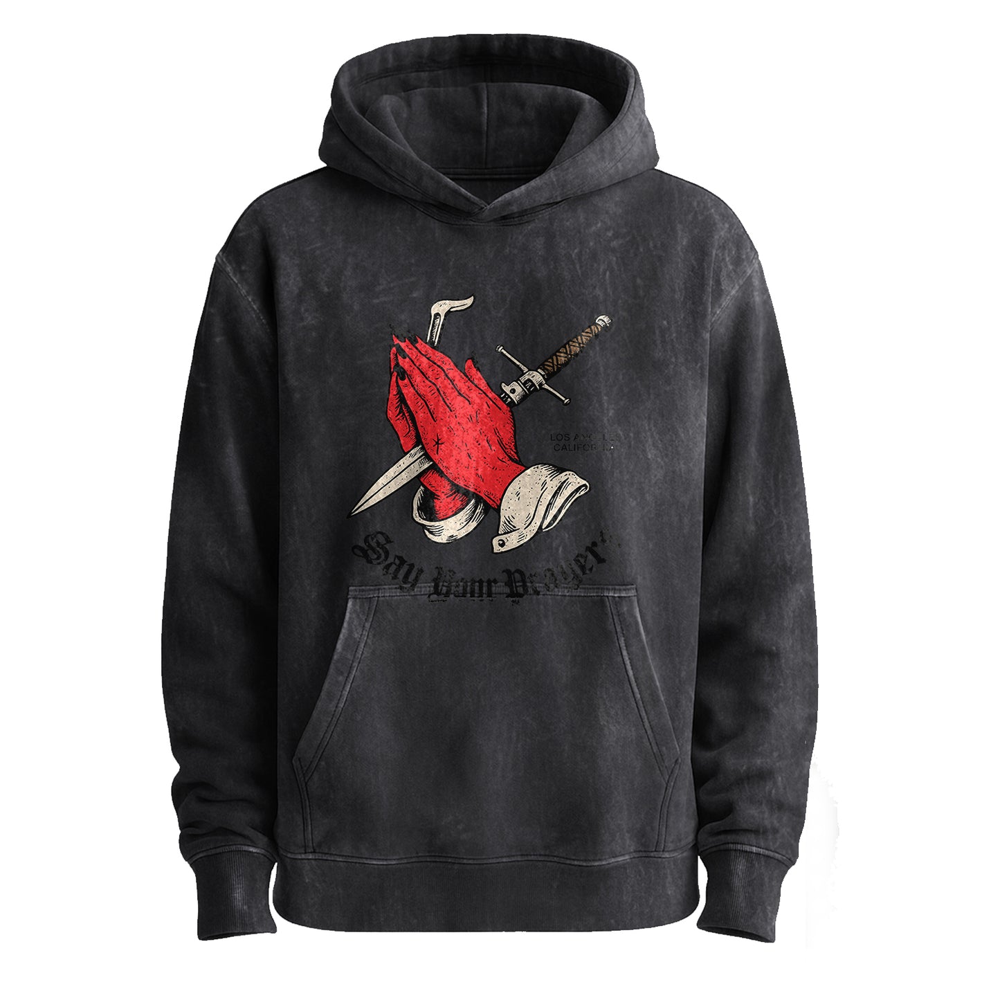 Prezzo normale $ 794.00 MXNGrintosa, reverente e un po' pericolosa. Questa felpa con cappuccio verde militare, con lavaggio vintage, presenta una grafica accattivante di mani rosse in preghiera sovrapposte a un pugnale e una spada, rifinita in caratteri gotici con la scritta "Say Your Prayers". Realizzata in robusto cotone 100% da 350 g, offre una sensazione di morbidezza e comfort fin dal primo momento in cui la indossi.