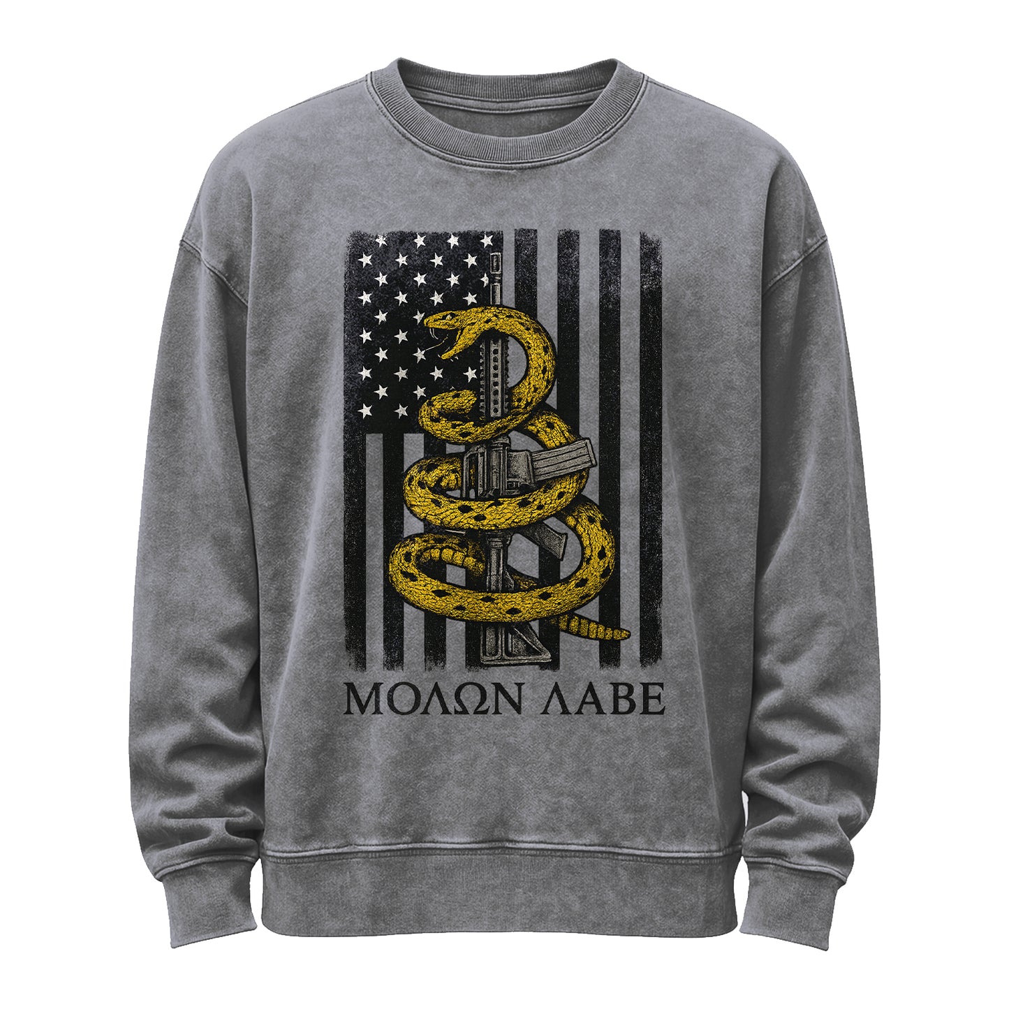 Prezzo normale $ 788.00 MXNAudace e consumata dalle battaglie. Questa felpa verde militare con effetto vintage wash presenta una bandiera americana in scala di grigi effetto consumato, un serpente a sonagli giallo arrotolato attorno a un fucile e la scritta greca "ΜΟΛΩΝ ΛΑΒΕ". Realizzata in robusto pile da 350 g (80% cotone / 20% poliestere) per una sensazione di morbidezza e comfort fin dal primo utilizzo.