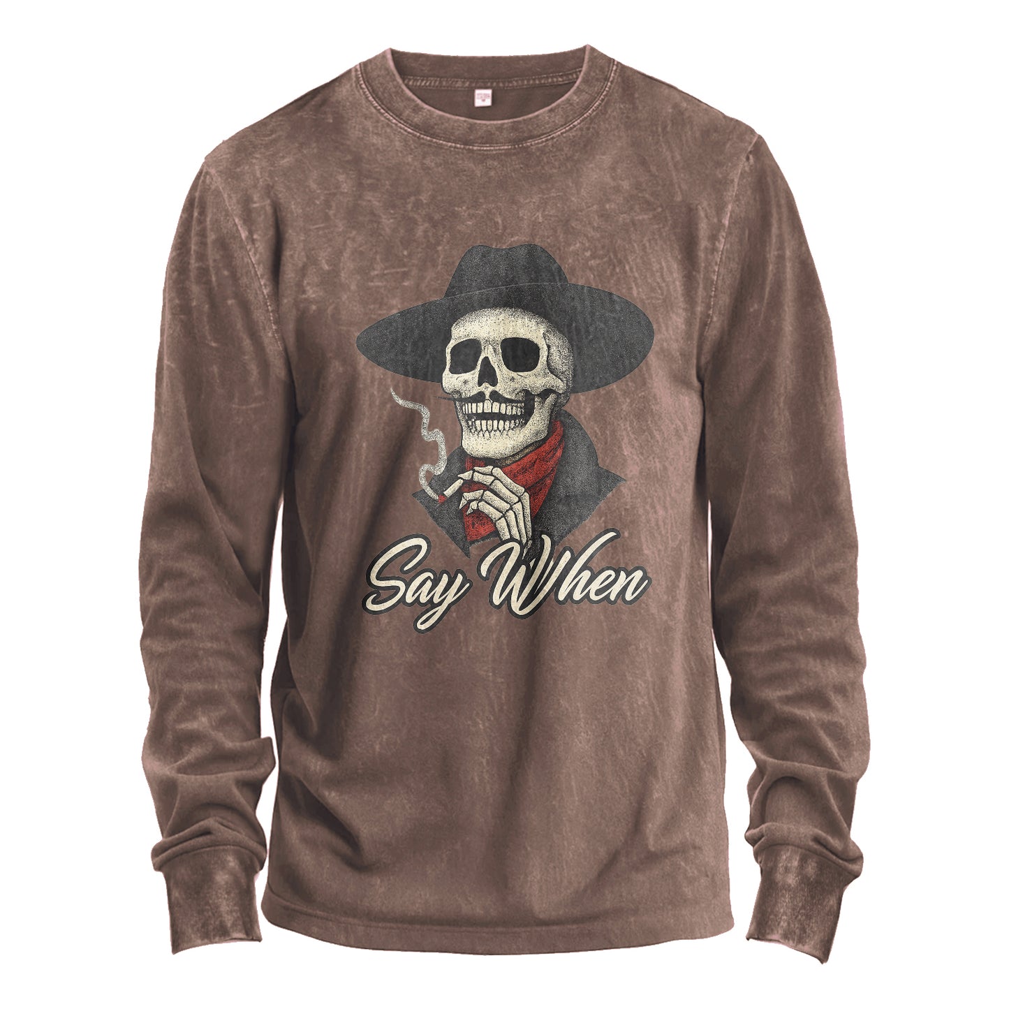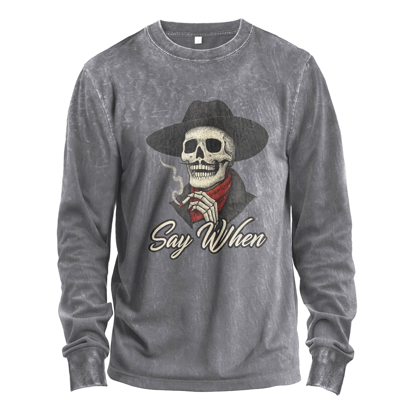 Prezzo normale $ 439.00 MXNGrinta western con un sorriso. Questa maglia a maniche lunghe color oliva, con lavaggio vintage, presenta uno scheletro di pistolero fumante e la scritta "Say When". Realizzata in robusto cotone 100% da 230 g, offre una sensazione morbida e confortevole che dura a lungo.