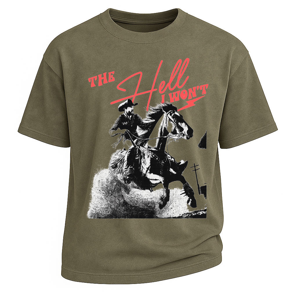 Prezzo normale $ 476.00 MXNIncarna l'intrepido spirito cowboy con la t-shirt LouMark "The Hell I Won't". Con un'audace grafica da rodeo rider e una sorprendente tipografia western, questa maglietta è pensata per i ribelli che non si arrendono mai. Realizzata in 100% cotone pesante da 260 g, offre resistenza, comfort e una silhouette oversize e robusta, perfetta per lo stile di vita western.
