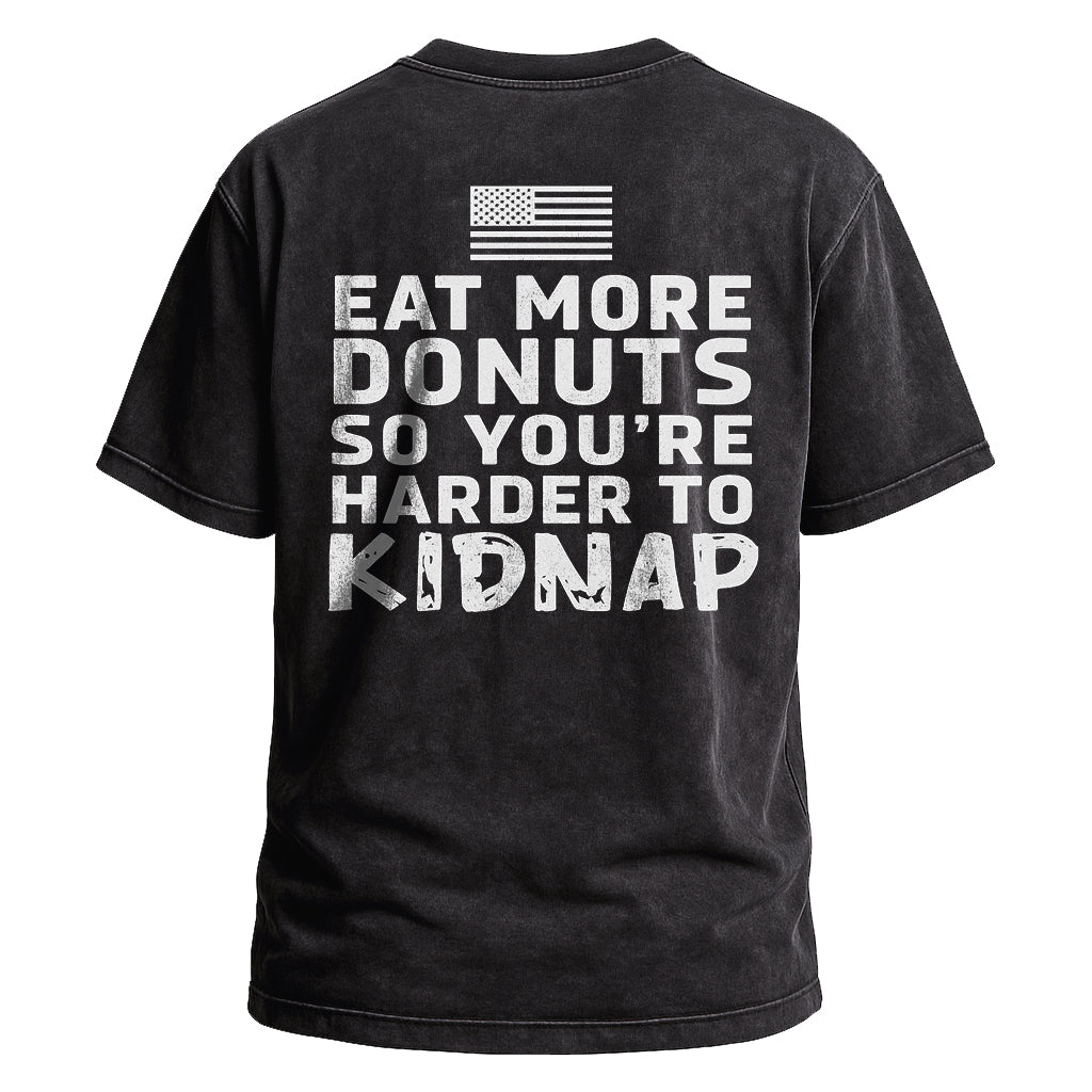 Precio regular $ 476.00 MXNMake a playful statement with LouMark’s Eat More Donuts Tee. This washed brown shirt features bold white typography on the back reading “EAT MORE DONUTS SO YOU’RE HARDER TO KIDNAP,” accompanied by a small American flag graphic. Crafted from 100% cotton for comfortable casual wear with a cheeky attitude.