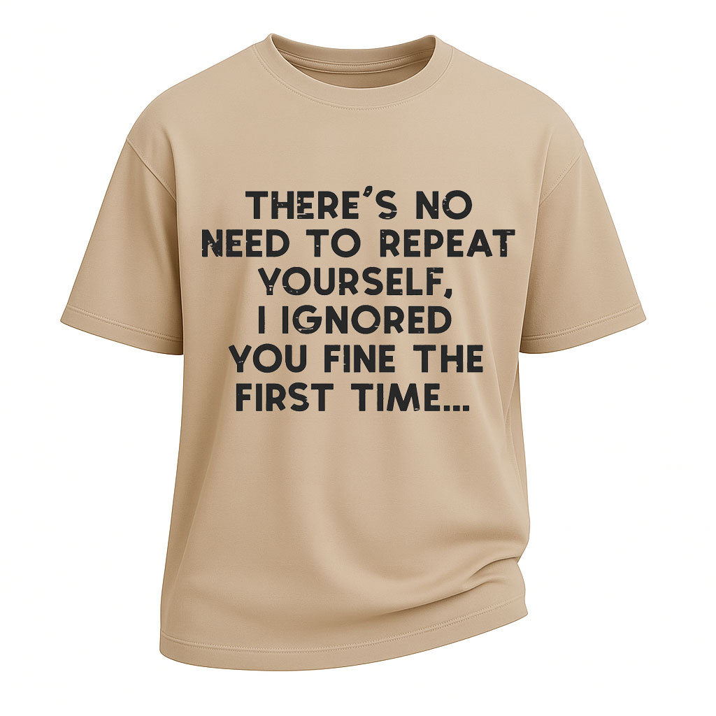 Precio regular $ 476.00 MXNBring sarcasm into your style with this Ignored You slogan short-sleeve t-shirt. Made from 260G 100% cotton, this heavyweight tee ensures long-lasting comfort and durability. The witty text print reads “THERE’S NO NEED TO REPEAT YOURSELF. I IGNORED YOU FINE THE FIRST TIME…,” creating a bold and humorous statement. With its standard fit and crew neckline, this tee is ideal for casual wear, parties, and streetwear looks.