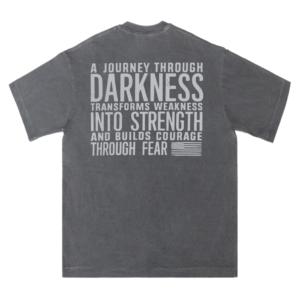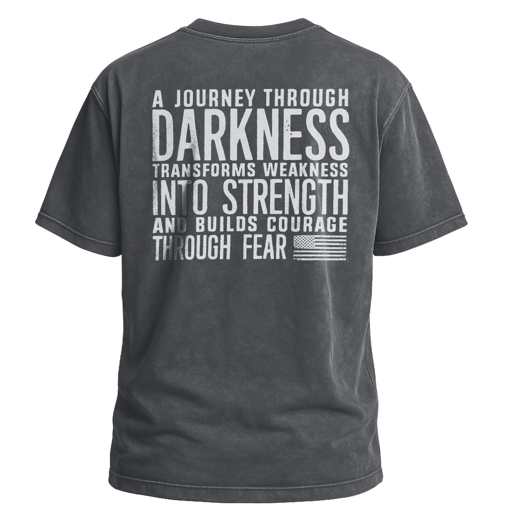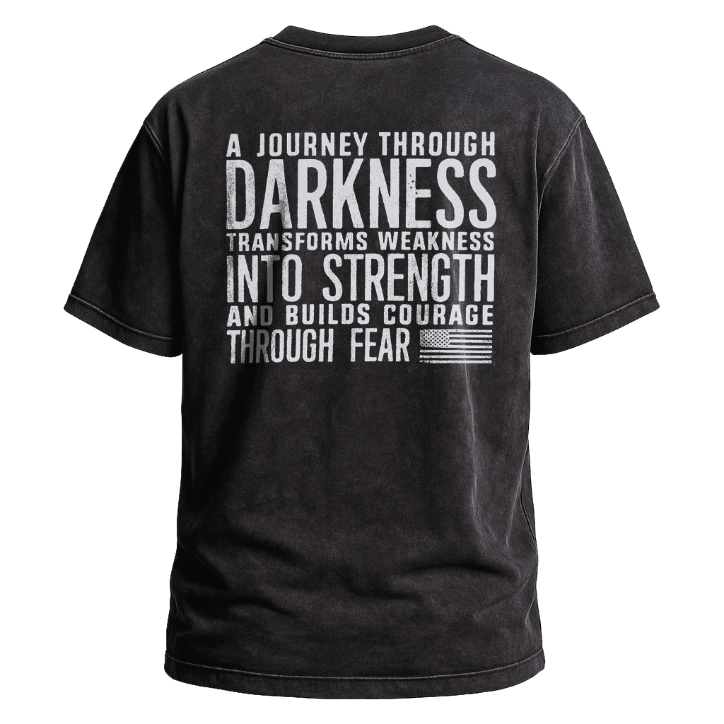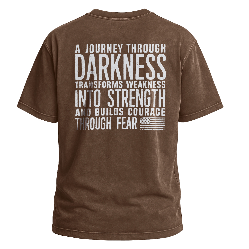 Precio regular $ 475.00 MXNEmbrace resilience with LouMark’s Journey Through Darkness Tee. This washed brown shirt features bold white typography on the back reading “A JOURNEY THROUGH DARKNESS TRANSFORMS WEAKNESS INTO STRENGTH AND BUILDS COURAGE THROUGH FEAR.” Made from 100% cotton for comfortable casual wear with an empowering message.