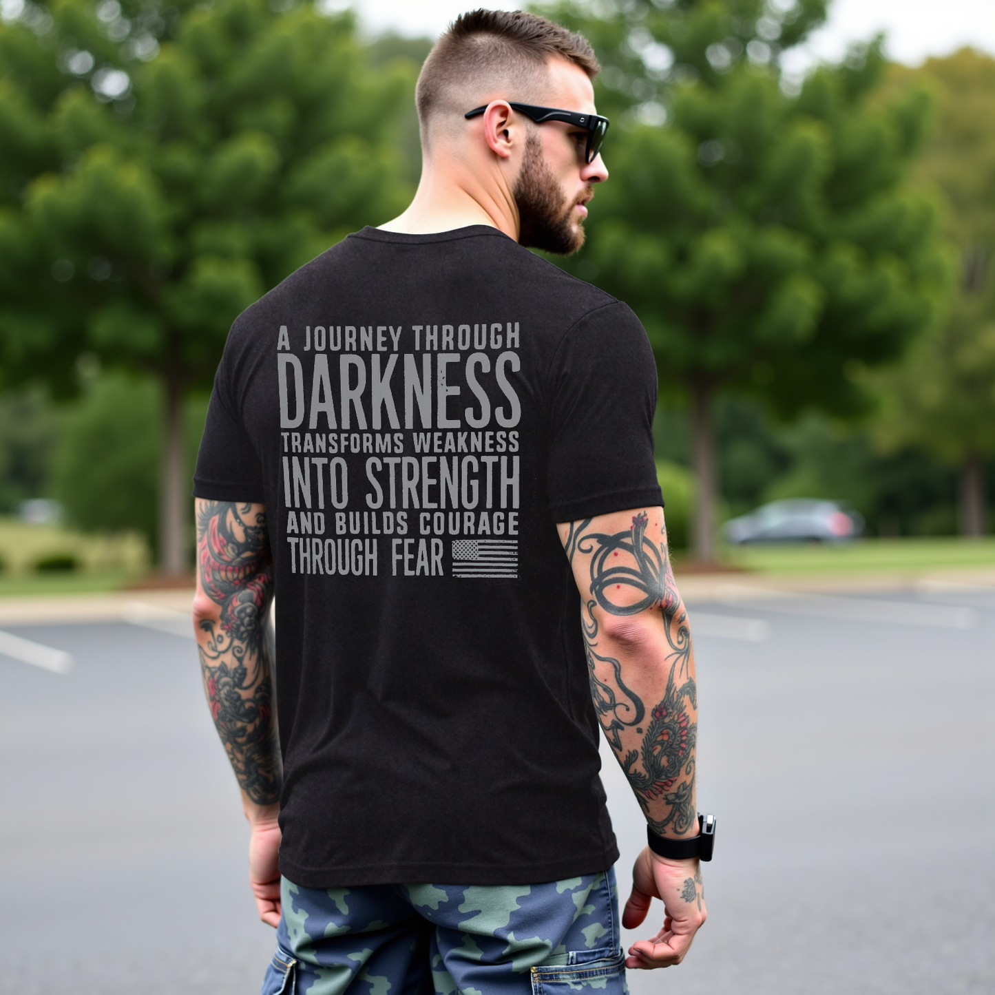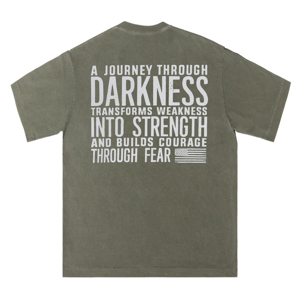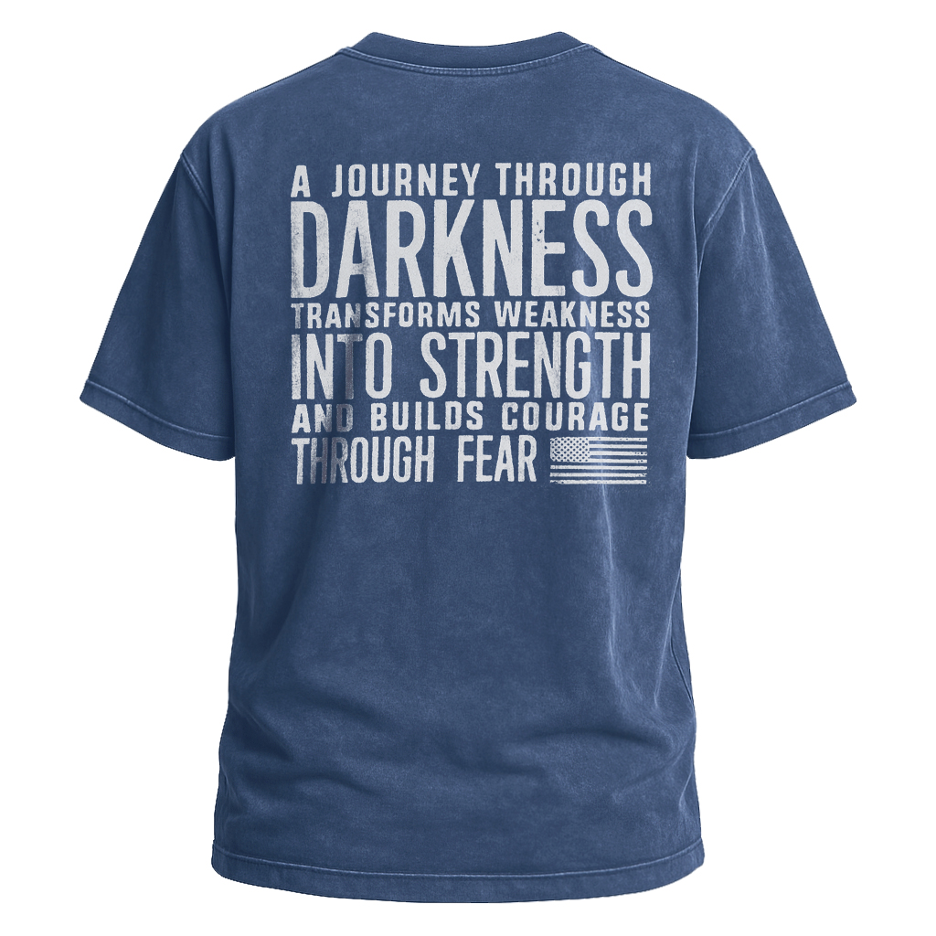 Precio regular $ 475.00 MXNEmbrace resilience with LouMark’s Journey Through Darkness Tee. This washed brown shirt features bold white typography on the back reading “A JOURNEY THROUGH DARKNESS TRANSFORMS WEAKNESS INTO STRENGTH AND BUILDS COURAGE THROUGH FEAR.” Made from 100% cotton for comfortable casual wear with an empowering message.