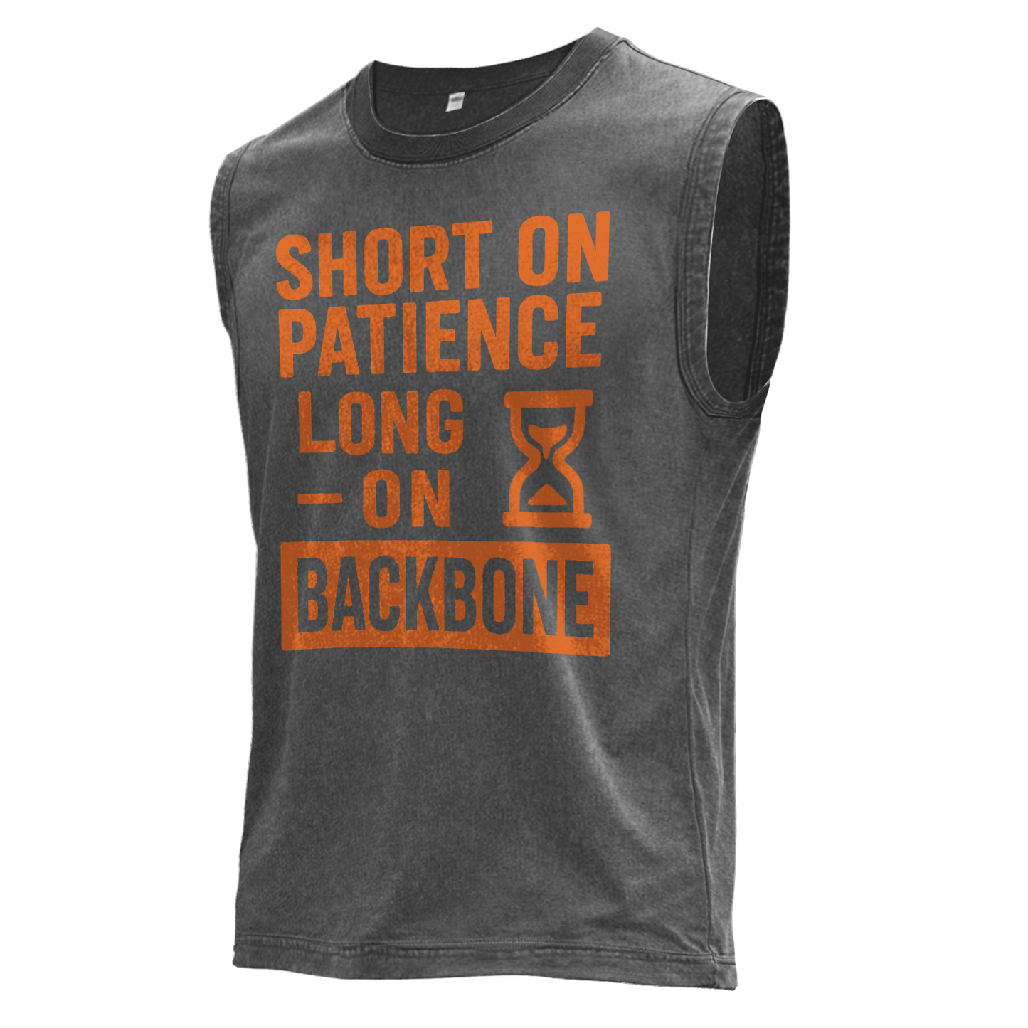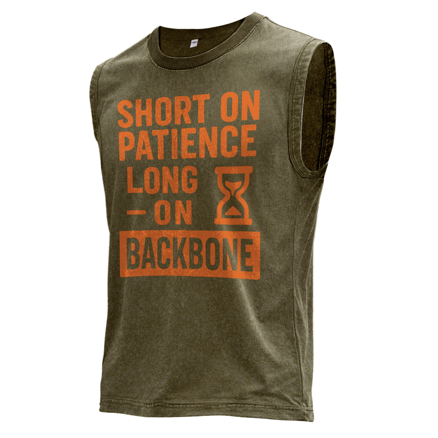 This vintage brown muscle tee features bold, distressed orange typography: stacked lines reading “SHORT ON PATIENCE / LONG — ON” beside an hourglass icon, finished with a boxed “BACKBONE.”