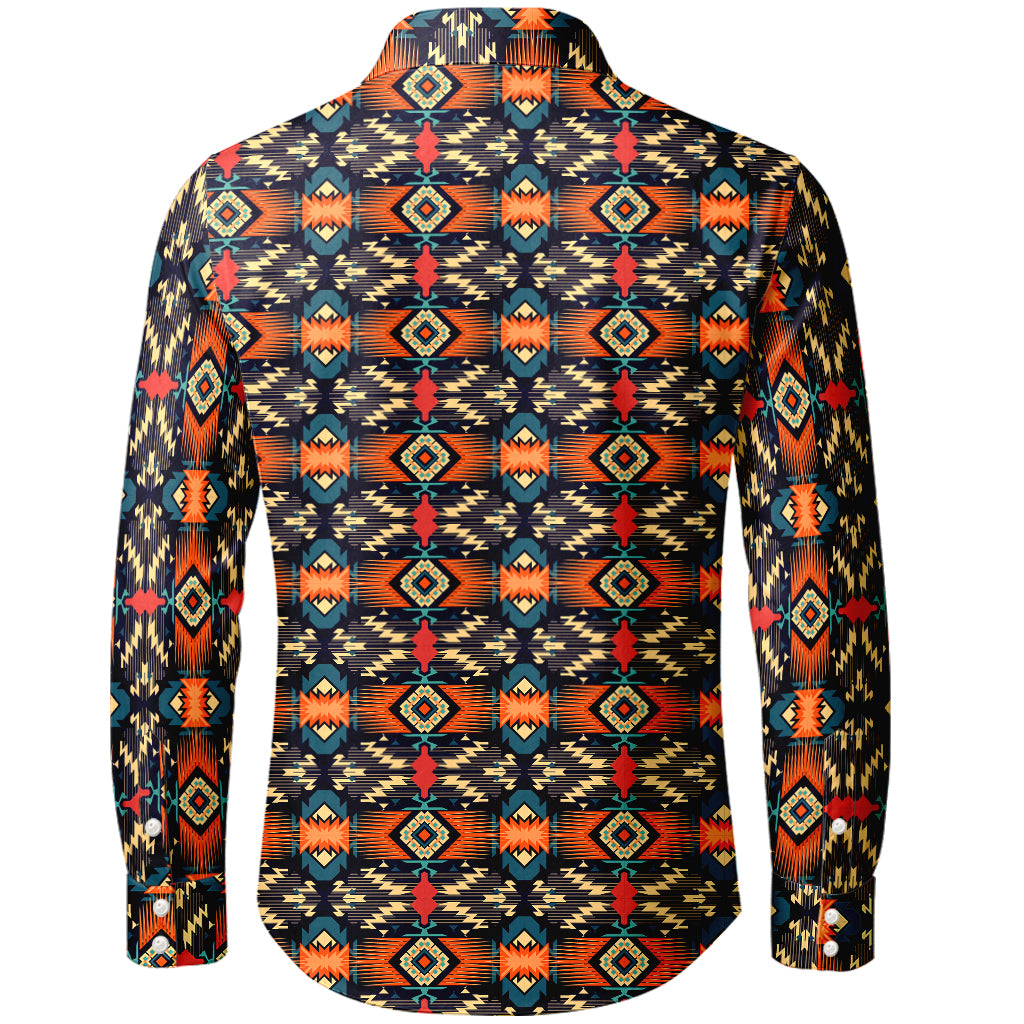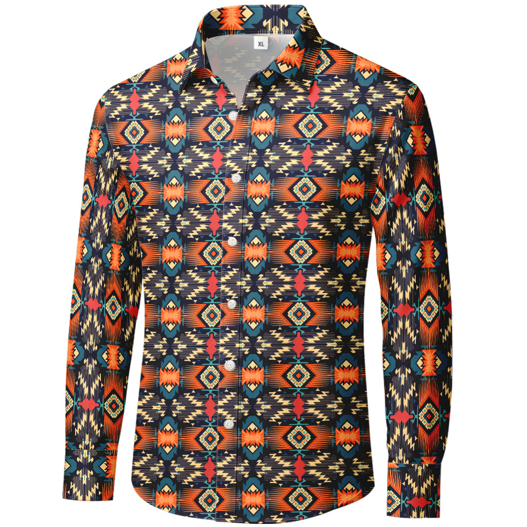 Precio regular $ 525.00 MXNTurn on the color. This long-sleeve button-up showcases a bold, southwestern-inspired geometric pattern in navy, orange, teal, and gold—printed edge-to-edge for a crisp, saturated look. The smooth 100% polyester fabric is lightweight, wrinkle-resistant, and quick-drying, perfect for festivals, nights out, or standout casual Fridays.