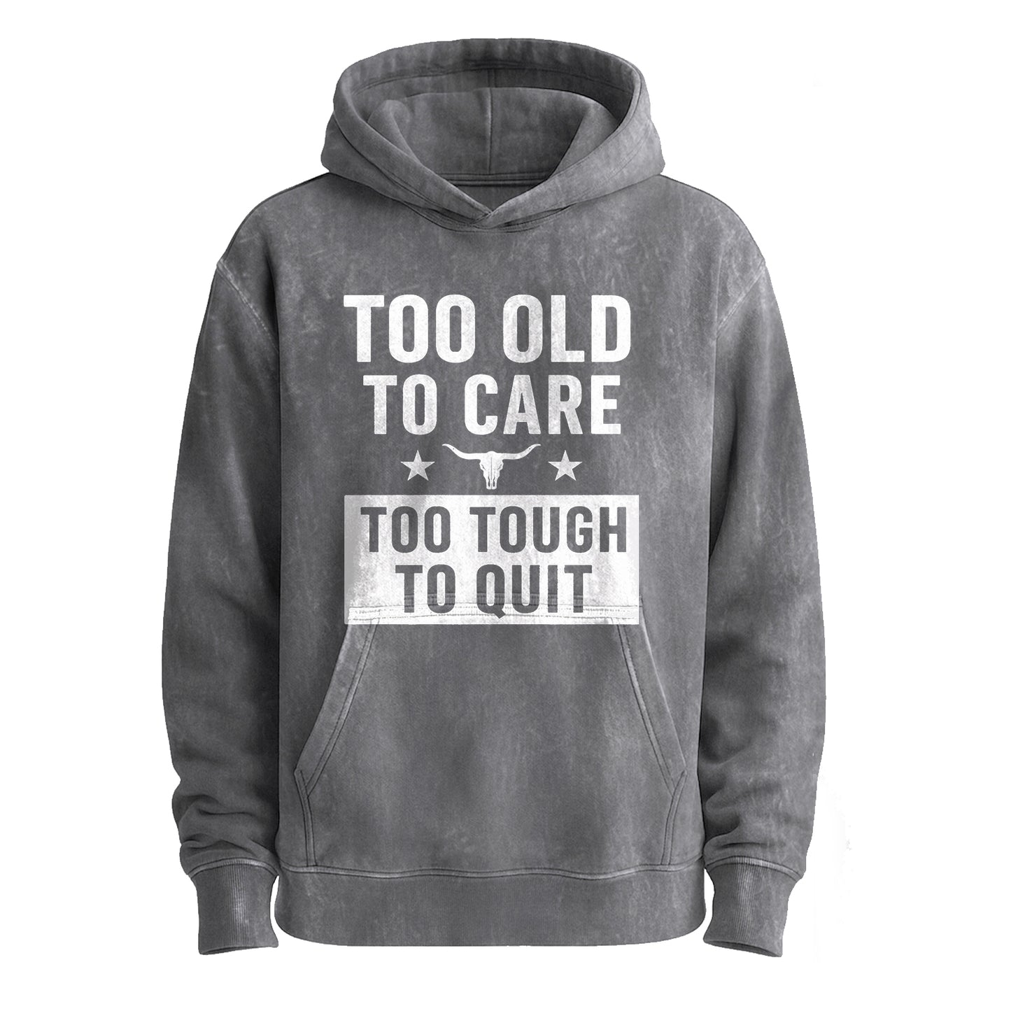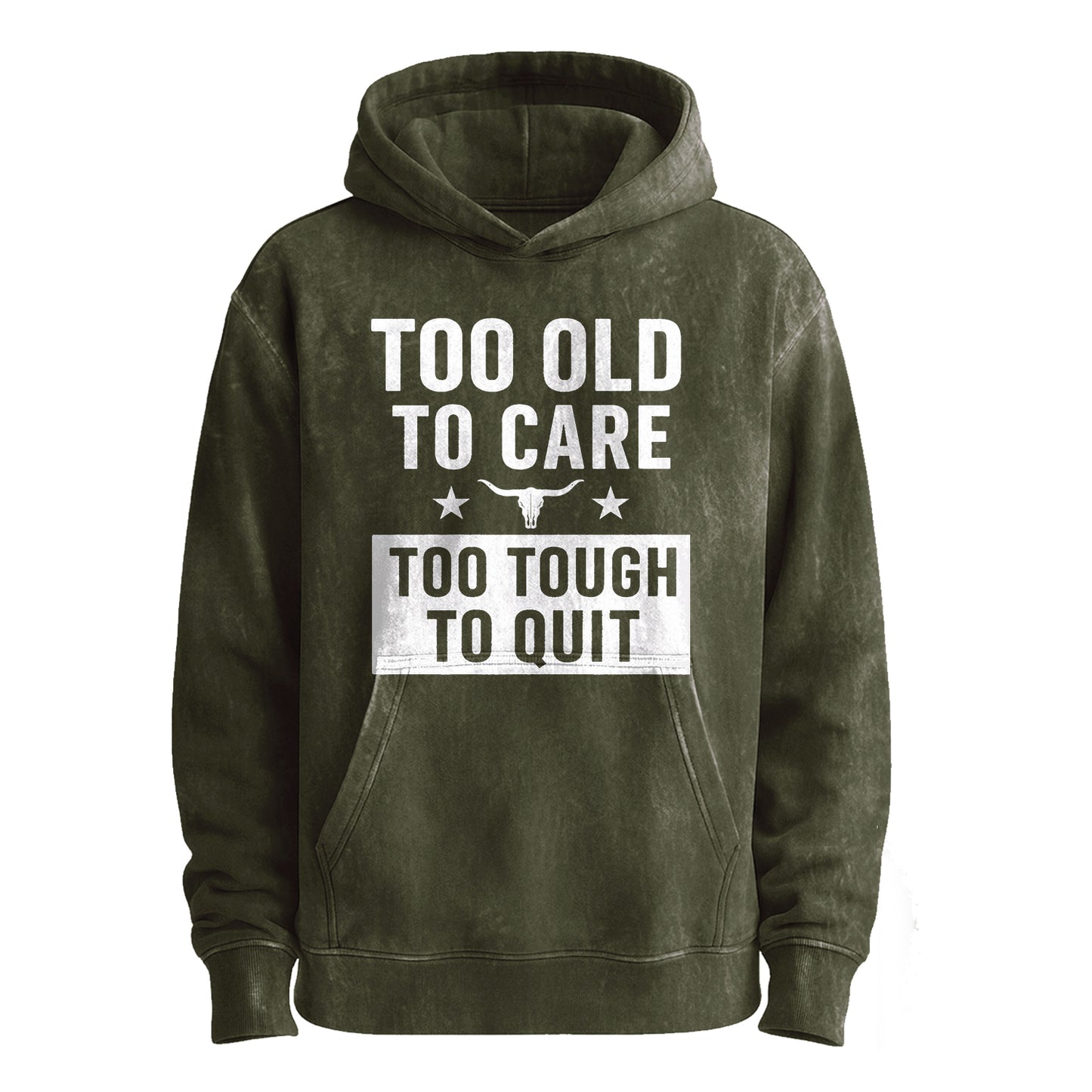 This vintage military green hoodie features bold, distressed white typography: “TOO OLD TO CARE” stacked above a block badge reading “TOO TOUGH TO QUIT,” flanked by stars and a longhorn skull icon.