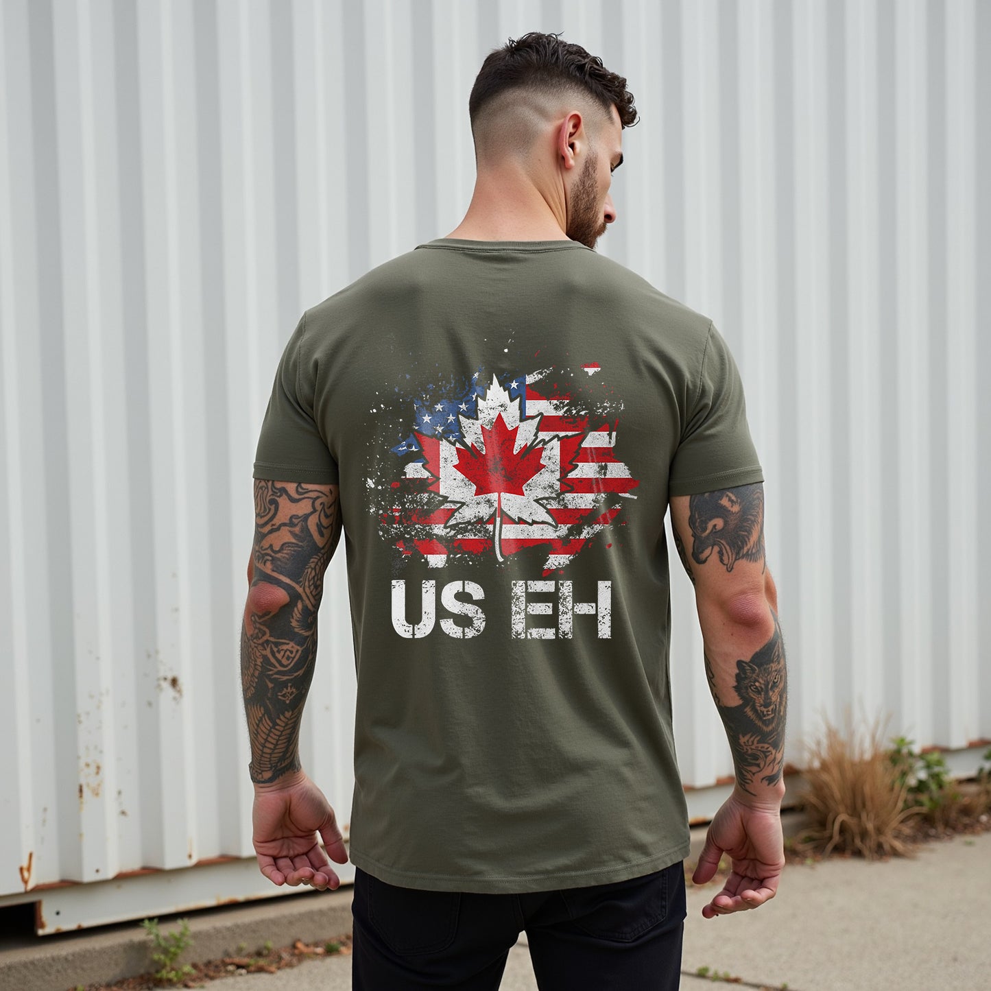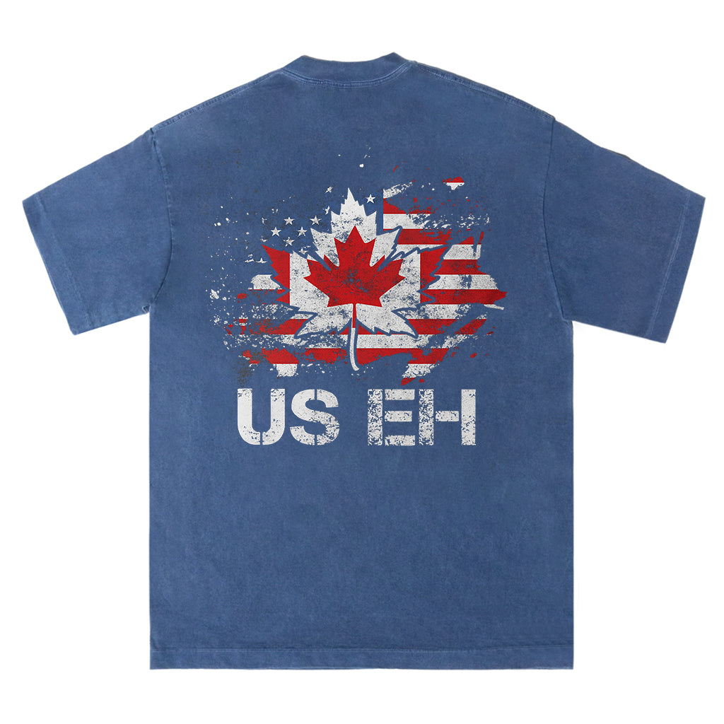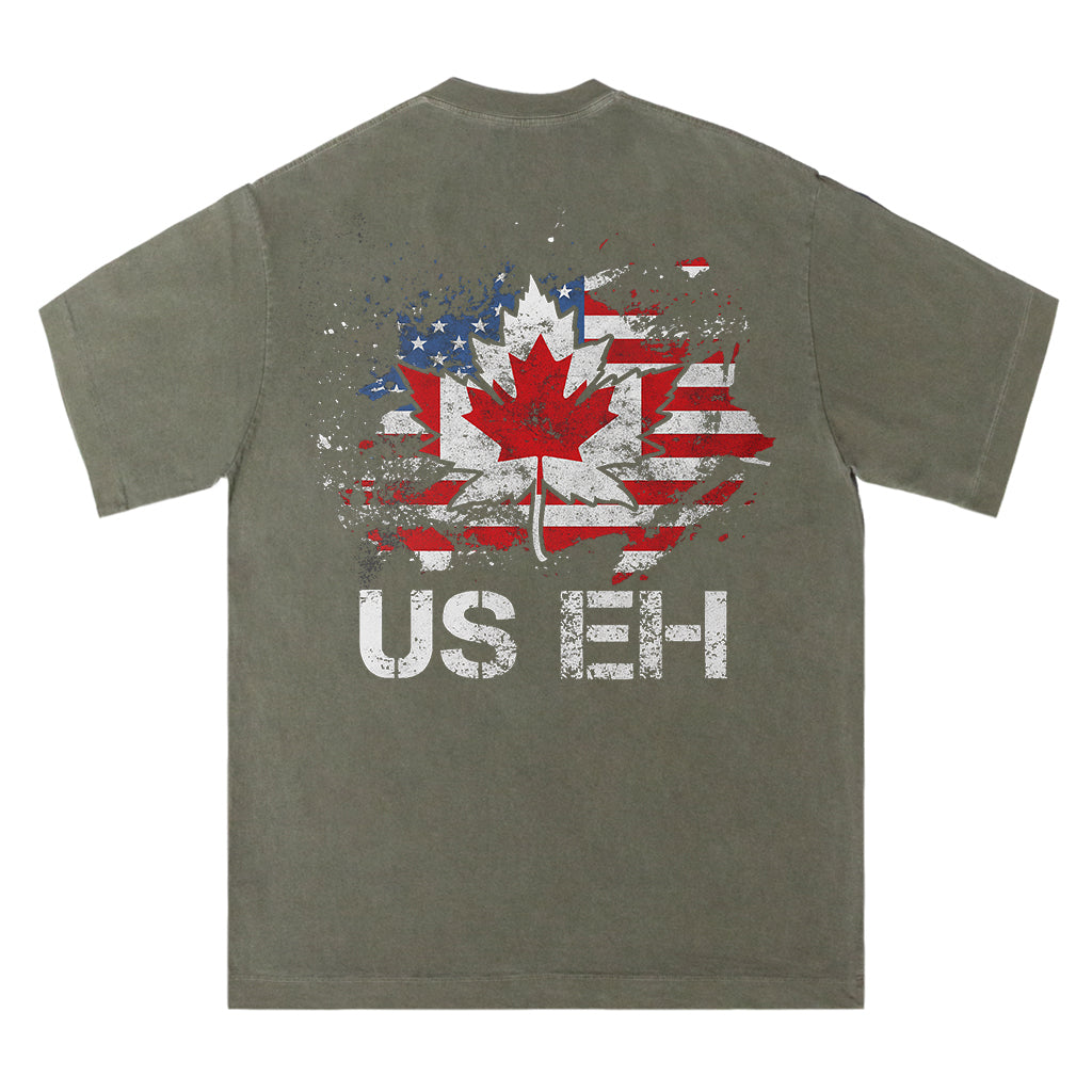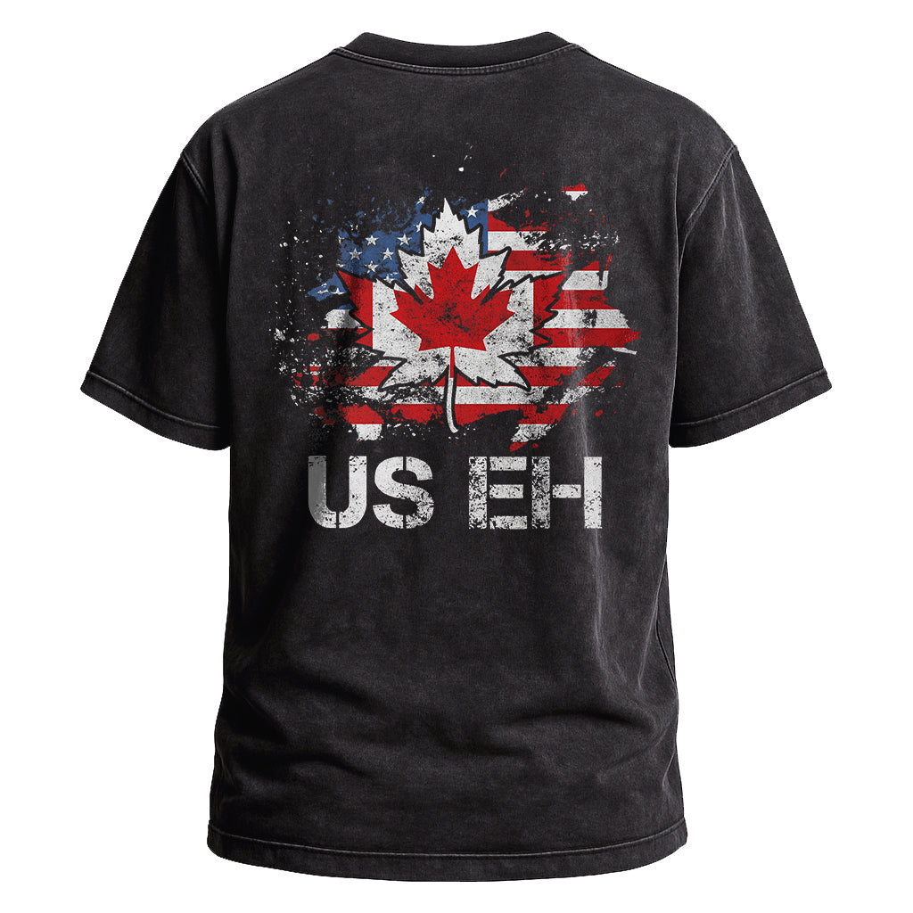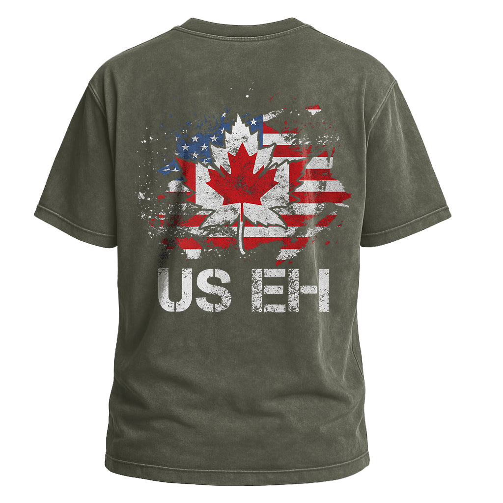 Precio regular $ 475.00 MXNCelebrate North American friendship with LouMark’s US EH Maple Leaf Tee. This washed brown shirt features a distressed graphic combining the American and Canadian flags with a prominent red maple leaf, accompanied by the text “US EH.” Made from 100% cotton for comfortable wear with a vintage, rugged look.