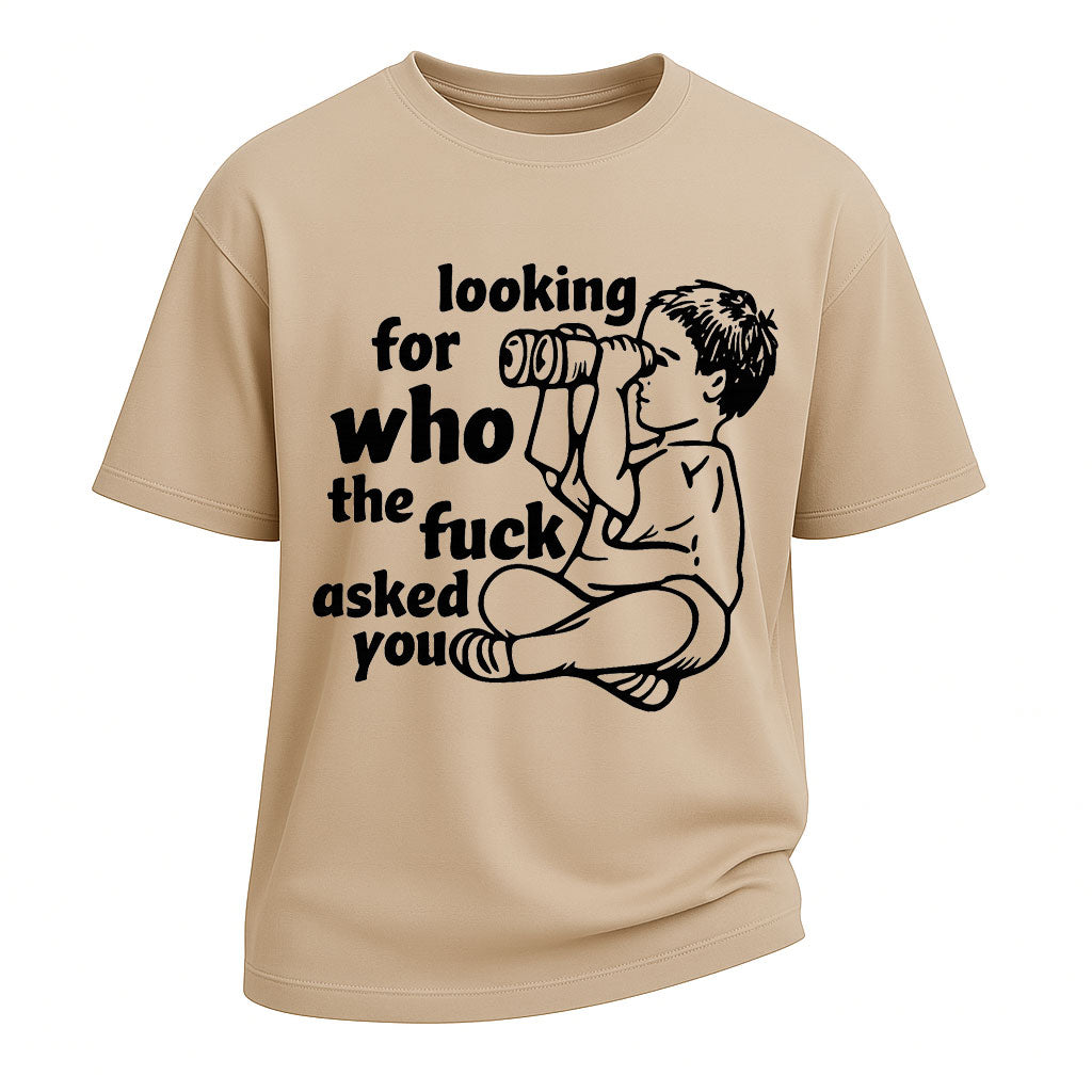 Preço Regular $ 406.00 MXNFor those who say it like it is—this LouMark original features a deadpan kid with binoculars and a savage question: “Looking for who the f*ck asked you.” Printed in stark black on heavyweight 260g pure cotton, this tee delivers heavyweight sarcasm with heavyweight fabric. Bold, unapologetic, and built for men who wear attitude like armor. Whether you're dodging drama or starting it, this shirt’s got your back.